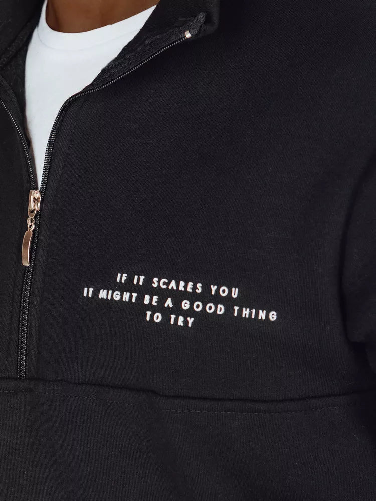 Stilingas vyriškas džemperis laisvu kirpimu. Modelis be gobtuvo, su praktišku pusilgiu užtrauktuku ir kengūros kišene. Subtilus raštas ant krūtinės suteikia madingą akcentą. Elastiniai rankogaliai ir apačia užtikrina gerą prigludimą. Universalus stilius, puikiai tinkantis kasdienai.