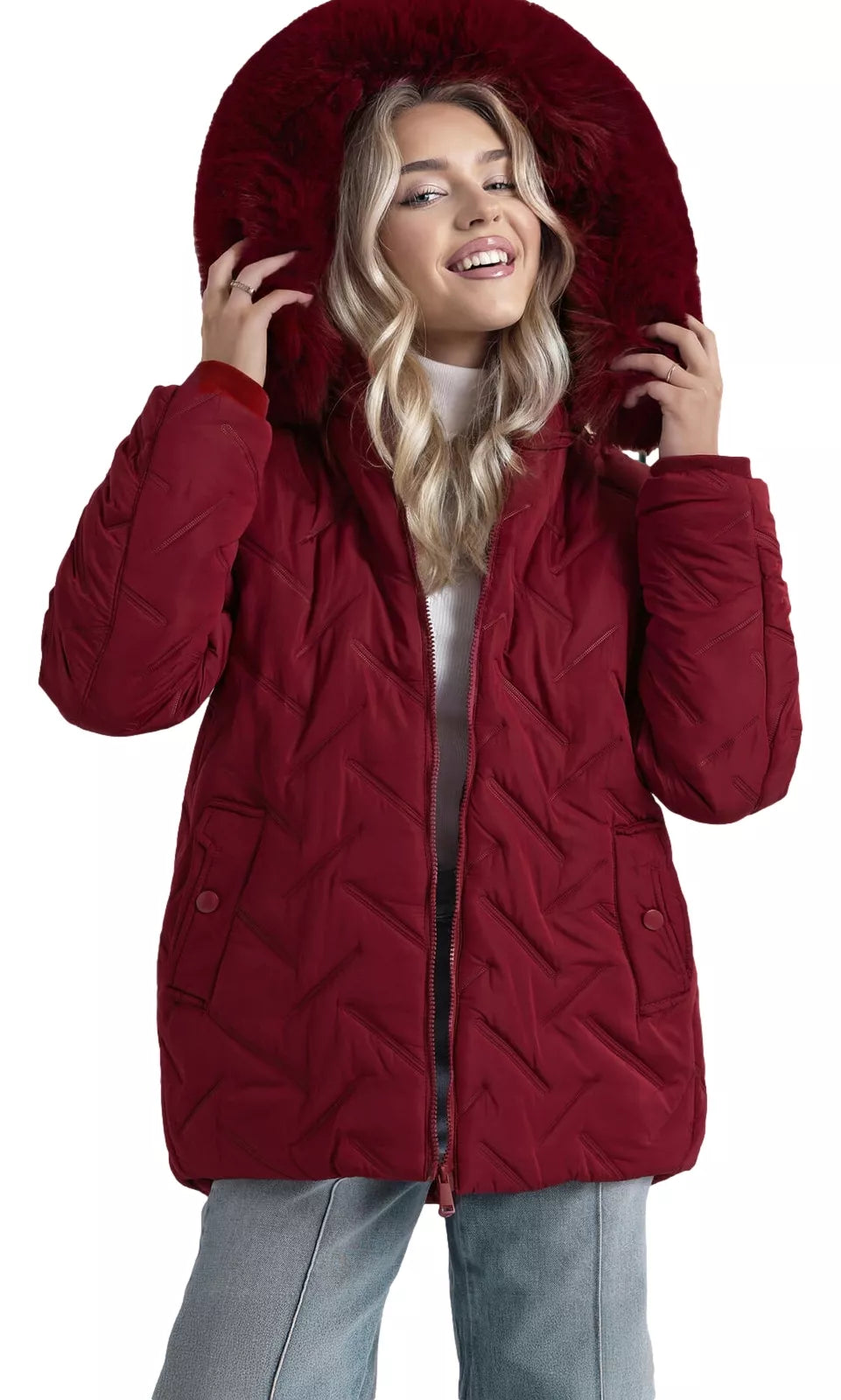 Moteriška žieminė striukė su dirbtinio kailio kapišonu