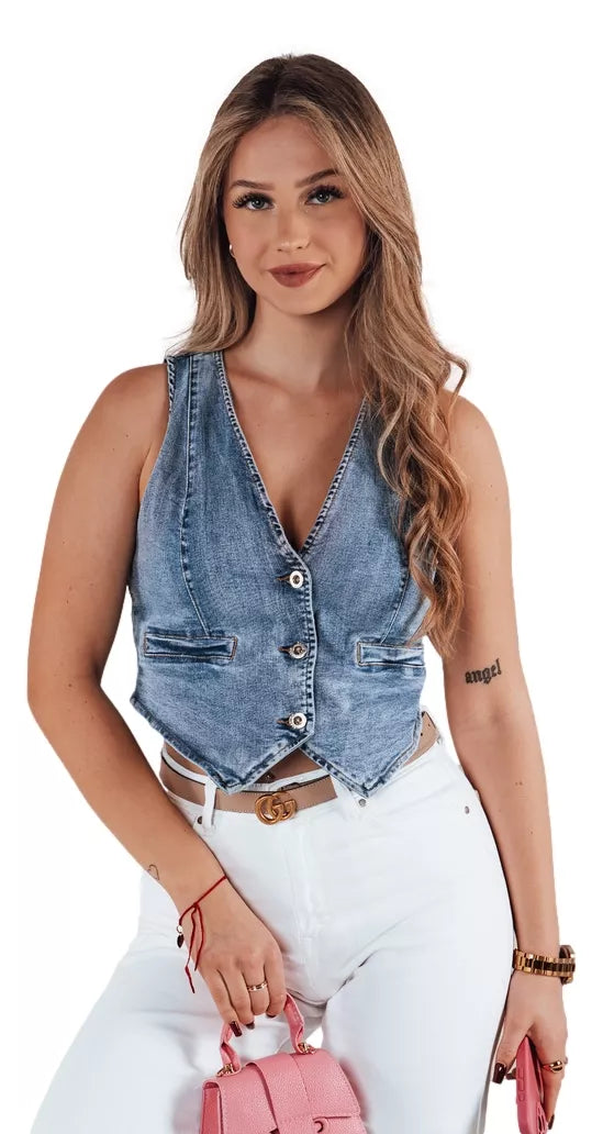 Džinsinė liemenė su moderniu kirpimu, puikiai pabrėžiančiu siluetą. Prigludusi liemenė ir efektingos detalės – dekoratyvinės kišenės ir sagos – suteikia stiliaus, o aukštos kokybės medžiaga užtikrina patogumą dėvint. Puikus pasirinkimas laisvalaikio stiliui su elegancijos prieskoniu, ji puikiai dera su baltomis kelnėmis ir sportbačiais.