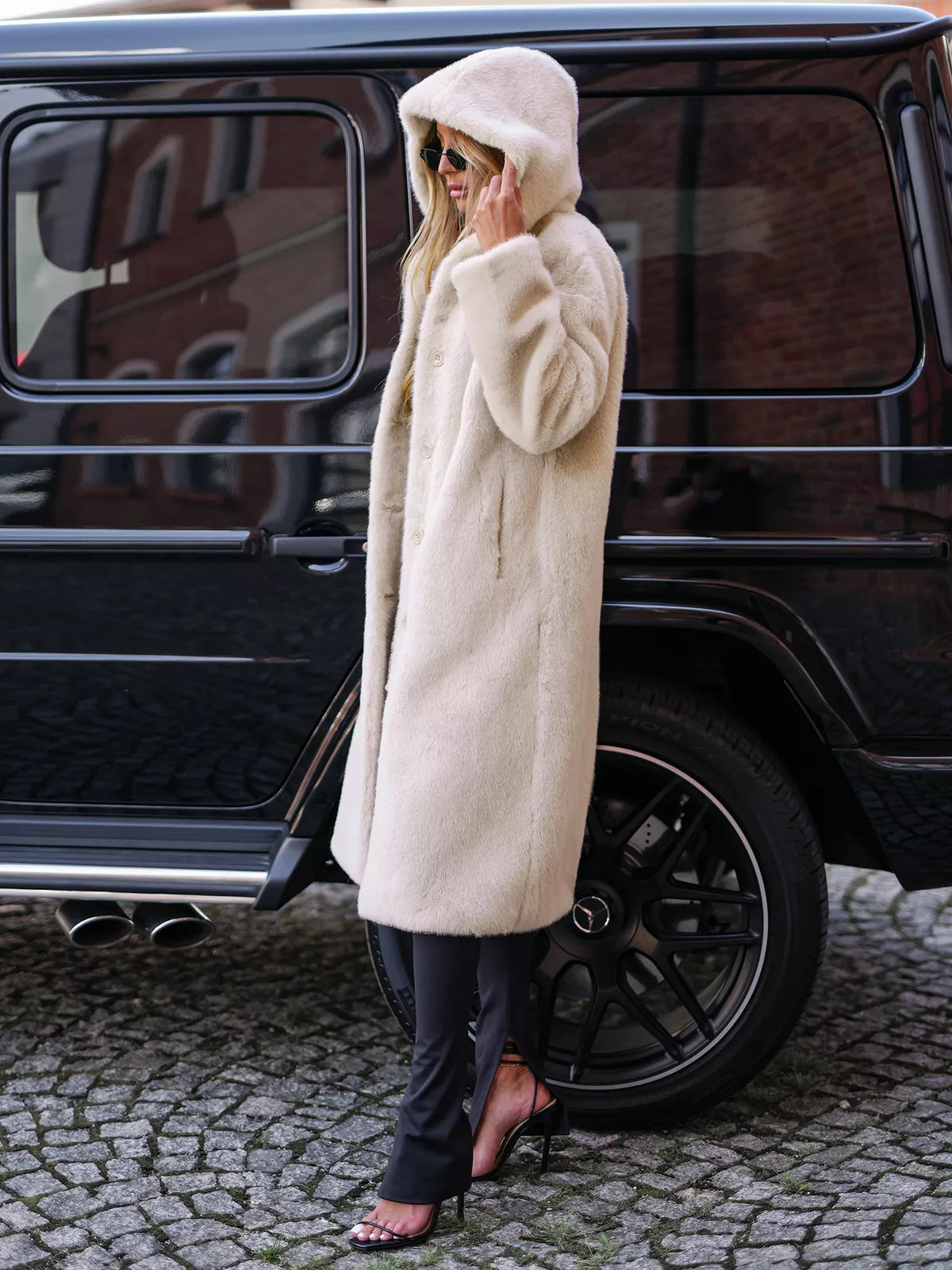 Elegantiški kailinukai su gobtuvu puikiai tinkantis šaltajam sezonui. Pagaminta iš švelnaus, minkšto dirbtinio kailio, kuris ne tik atrodo prabangiai, bet ir užtikrina jaukumą bei komfortą. Ilgas modelis suteikia papildomą apsaugą nuo šalčio. Užsegama sagomis priekyje – patogus ir klasikinis sprendimas. Tinka tiek kasdieniam dėvėjimui, tiek elegantiškoms progoms. Modernus dizainas – puikiai dera prie miesto stiliaus ar vakarinio įvaizdžio. Stilingas pasirinkimas moteriai, kuri vertina prabangą, jaukumą ir nori atrodyti nepriekaištingai net šalčiausiomis dienomis.