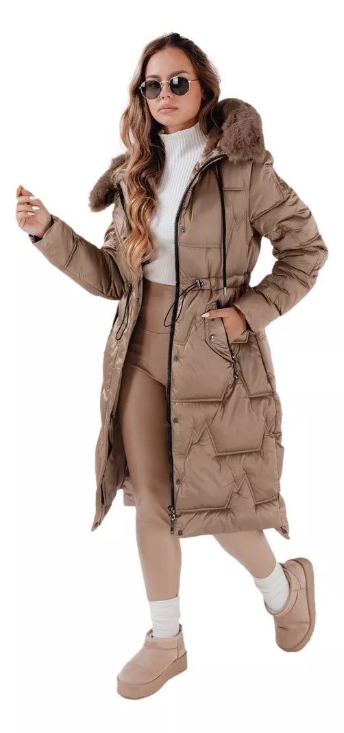 Ši praktiška ir moteriška dygsniuota striukė su gobtuvu ir kailio apdaila – puikus pasirinkimas šaltoms dienoms. Ji siekia žemiau kelių, taip suteikdama papildomą apsaugą nuo šalčio, o modernus kirpimas paryškina figūrą dėl reguliuojamo juosmens. Midi ilgis – efektyviai apsaugo nuo šalčio ir vėjo. Kailis ant gobtuvo – akį traukianti detalė, kurią galima nuimti. Reguliuojamas gobtuvas – geriau priglunda bet kokiu oru. Dvi užtraukiamos kišenės – saugi ir patogi vieta smulkiems daiktams. Raištelis ties juosmeniu – leidžia pritaikyti striukę prie savo figūros. Dėl tvirto paminkštinimo ir gerai apgalvoto kirpimo ši striukė puikiai tinka žiemai. Tokios detalės kaip siūlės, dvigubas užsegimas ir kailiu apsiūtas gobtuvas suteikia stilingo akcento. Puikus pasirinkimas tiek kasdieniam dėvėjimui, tiek ilgesniems pasivaikščiojimams šaltu oru.