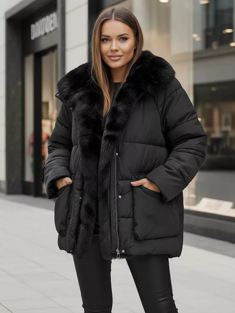 Stilinga ir šilta moteriška žieminė striukė su dirbtinio kailio apdaila – idealus pasirinkimas ieškančioms komforto ir elegancijos net šalčiausiomis dienomis. Ši striukė pasižymi moderniu, lengvai priderinamu dizainu, kuris puikiai tinka tiek kasdienai, tiek išėjimams į miestą.