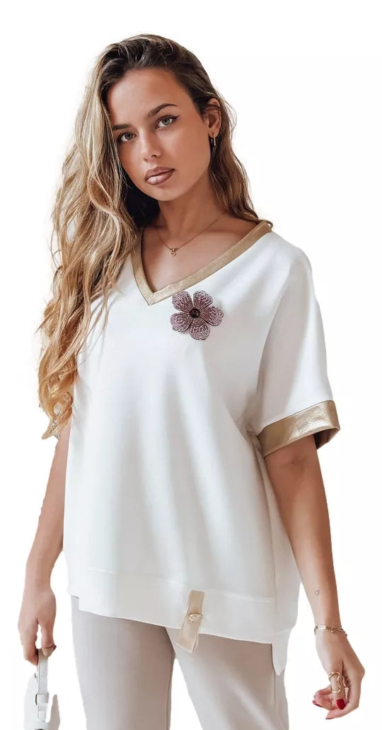 Didelio kirpimo moteriška palaidinė laisvalaikio stiliumi su efektinga apdaila – idealus pagrindas daugeliui pavasario stilių. Universalus dydis tinka nuo XS iki L. V formos iškirptė gražiai atidengia kaklą, o rankovės su dekoratyvinėmis juostomis suteikia elegancijos. Modelis dekoruotas gėlių motyvu su cirkoniais ant krūtinės ir maža sagute apačioje. Ilgesnė nugara puikiai dera tiek su aptemptomis kelnėmis, tiek su sijonais.