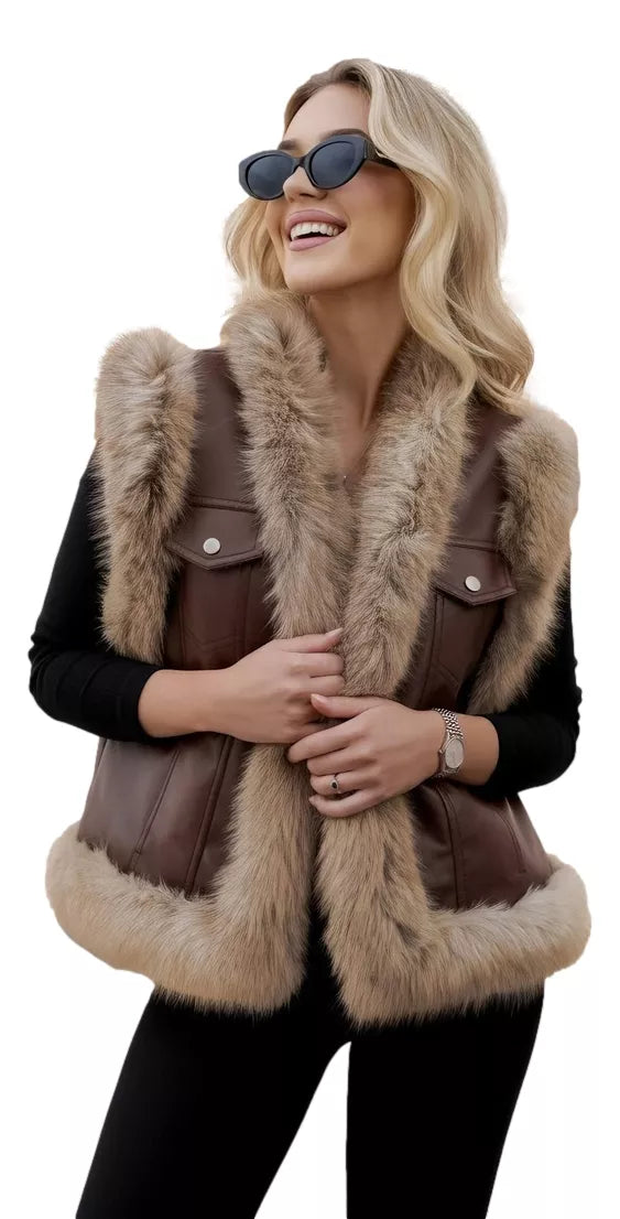 Liemenė pagaminta iš aukštos kokybės ekologiškos odos, o jos vidų ir kraštus puošia purus dirbtinis kailis, suteikiantis jaukumo bei prabangos pojūtį. Klasikinė liemenės spalva kartu su natūralaus atspalvio kailio apdaila sukuria išskirtinį kontrastą, kuris tiks tiek miesto stiliui, tiek laisvalaikiui.