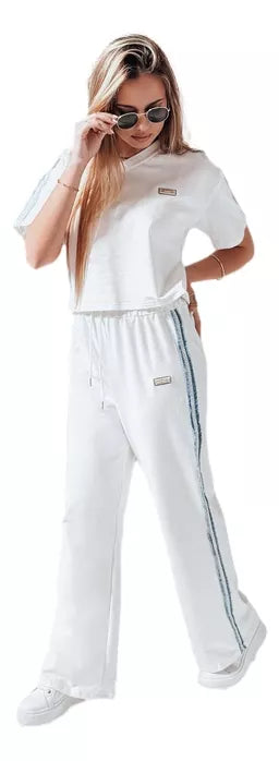 Šis moteriškas sportinio kostiumo komplektas, kurį sudaro trumpi marškinėliai ir plačios kelnės, puikiai tinka pavasariui ir šiltesnėms dienoms. Viršutinė dalis turi V formos iškirptę, dekoratyvines 3D efekto juostas ant pečių ir mažą lopą ant krūtinės. Aukšto liemens kelnės su tampria juostele ir raišteliu užtikrina visišką komfortą. 3D juostelės kojų šonuose suteikia mados akcento. Šis komplektas puikiai tinka pavasariui, laisvalaikiui ir kasdieniam dėvėjimui.