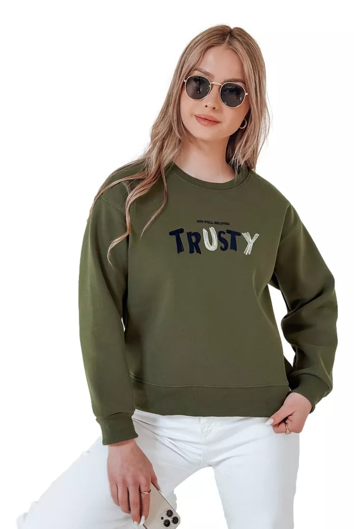 Moteriškas džemperis su dekoratyviniu "TRUSTY" užrašu 3D efekte – puikus pasirinkimas mėgstančioms patogius, bet stilingus drabužius. Modelis pagamintas iš minkštos medžiagos, užtikrinančios komfortą dėvint, o elastingi rankogaliai neleidžia prarasti formos. Universalus dydis tinka nuo XS iki L. Išsiuvinėtos raidės su įvairiomis tekstūromis sukuria įdomų vaizdinį kontrastą. Puikiai tinka prie laisvalaikio, pavasario aprangos.