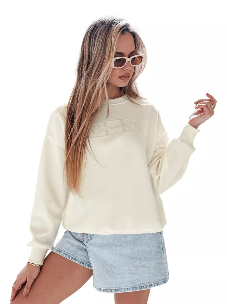 Moteriškas džemperis su išsiuvinėtais motyvais: šypseną, širdelę ir užrašas "TAKE EASY". Patogus džemperis su apvalia iškirpte ir elastingais rankogaliais ant rankovių ir apačioje. Vienas dydis tinka visiems nuo XS iki L. Minkšta medžiaga užtikrina patogumą kasdieniam dėvėjimui. Puikus pasirinkimas pavasario dienoms, kai svarbiausia patogumas ir stilius.