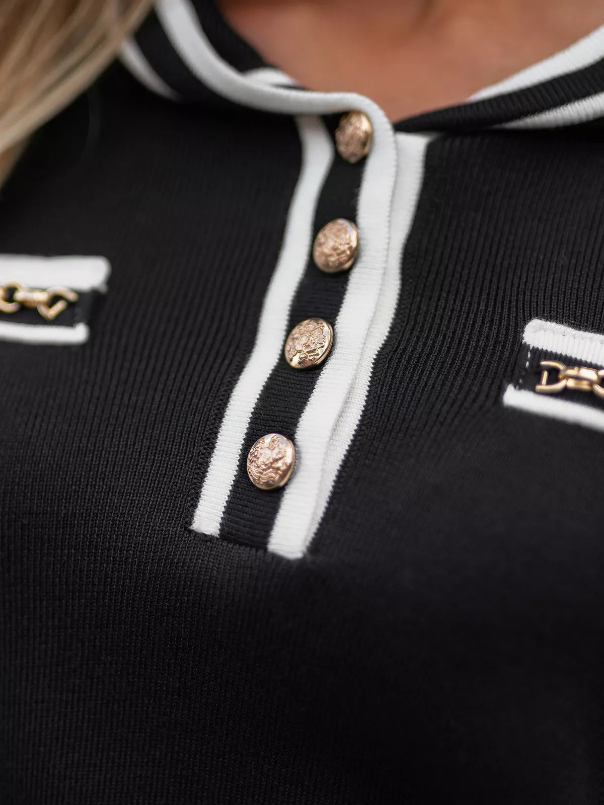 Moteriškas dviejų dalių laisvalaikio kostiumas juodas su subtiliais baltais akcentais. Komplektą sudaro džemperis su ilgomis rankovėmis ir plačios kelnės. Džemperis ilgomis rankovėmis, laisvo kritimo dekoruotas baltu krašteliu palei apykaklę ir sagų juostelę. Priekyje – kelių sagų užsegimas. Ant krūtinės – dekoratyvinė aplikacija su užrašu. Kelnės juodos spalvos, plačios, patogaus kritimo elastinga juosmens juosta su raišteliu Stilius: laisvalaikio, sportinis, modernus, tinkamas kasdieniam dėvėjimui, kelionėms ar aktyviam poilsiui