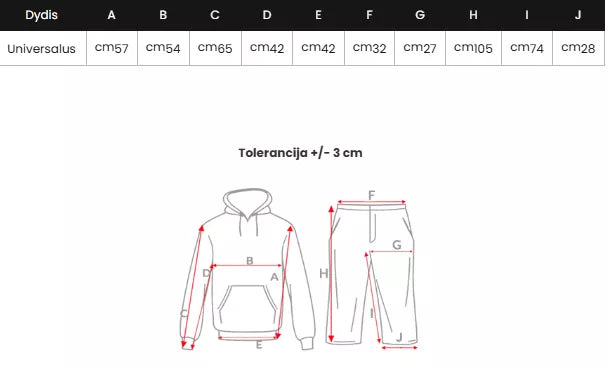 Moteriškas dviejų dalių sportinis kostiumas. Komplektą sudaro džemperis su užtrauktuku ir plačios kelnės. Spalva: juoda su baltais akcentais. Džemperis užsegamas užtrauktuku priekyje, baltos spalvos rankogaliai, apykaklė ir apačia. Dekoruotas subtiliomis baltomis linijomis išilgai rankovių. Ant krūtinės – maža aplikacija su „R“ raide. Kelnės juodos spalvos, plačios, laisvo kritimo. Išilgai abiejų kojų eina baltos linijos. Stilius: laisvalaikio, sportinis, modernus, tinkamas tiek kasdienai, tiek kelionėms ar aktyviam laisvalaikiui.