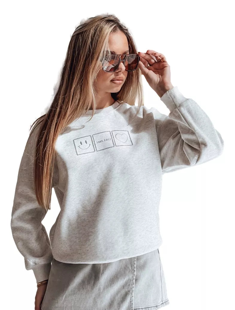 Moteriškas džemperis su išsiuvinėtais motyvais: šypseną, širdelę ir užrašas "TAKE EASY". Patogus džemperis su apvalia iškirpte ir elastingais rankogaliais ant rankovių ir apačioje. Vienas dydis tinka visiems nuo XS iki L. Minkšta medžiaga užtikrina patogumą kasdieniam dėvėjimui. Puikus pasirinkimas pavasario dienoms, kai svarbiausia patogumas ir stilius.