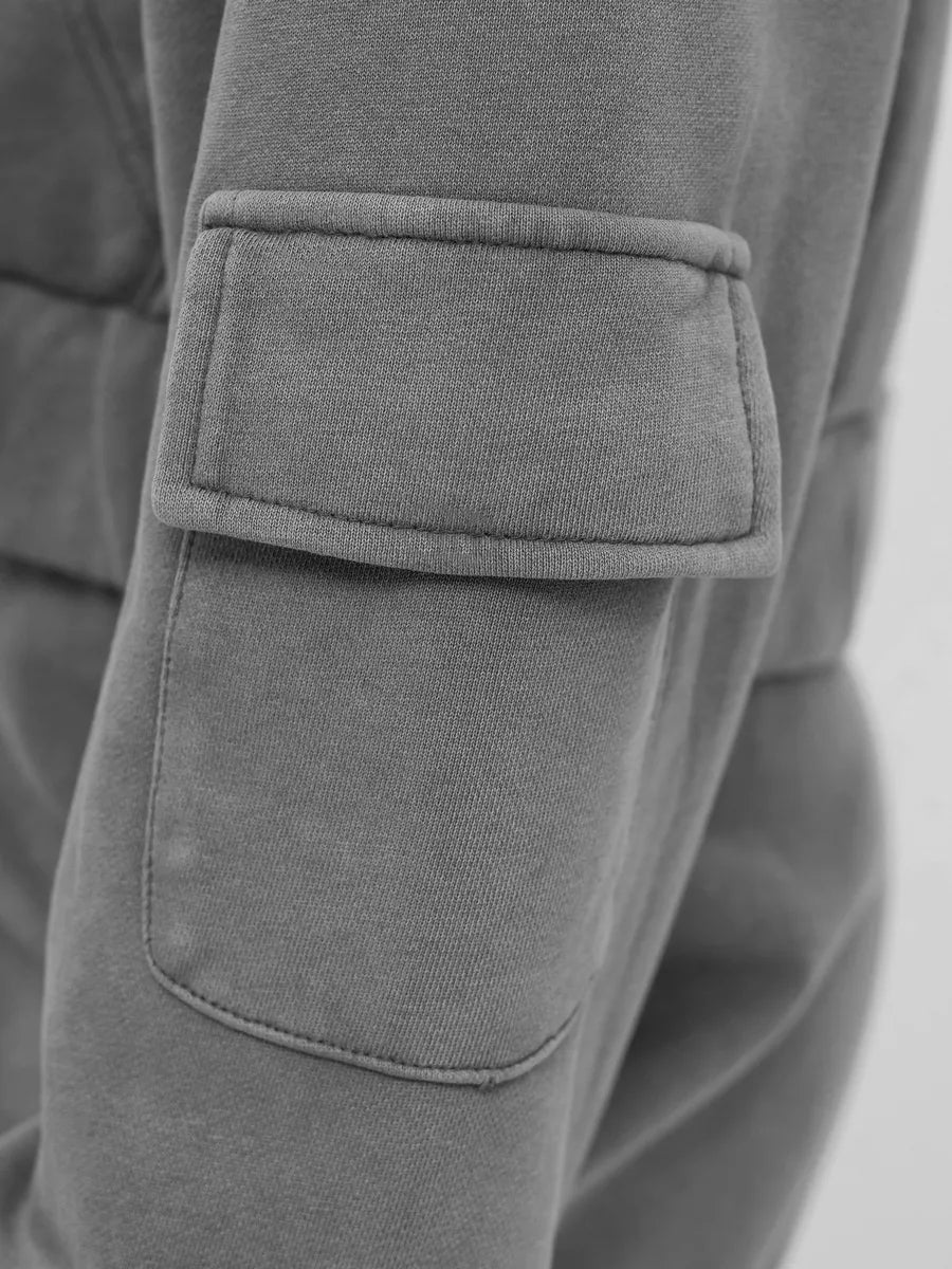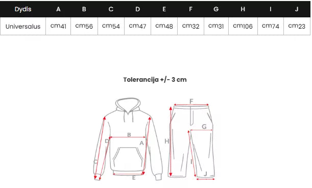Sportinis laisvalaikio komplektas spinduliuoja patogumą ir universalumą. Viršutinė dalis – užsegama džemperio tipo striukė su gobtuvu ir ilgomis rankovėmis, puikiai tinkanti apsaugai nuo vėsesnio oro. Apatinė dalis – plačios kelnės su šoninėmis kišenėmis, užtikrinančios praktiškumą ir laisvą judėjimą. Komplektas puikiai dera su sportiniais batais ir yra idealus pasirinkimas tiek poilsiui namuose, tiek lengvam aktyviam laisvalaikiui lauke.
