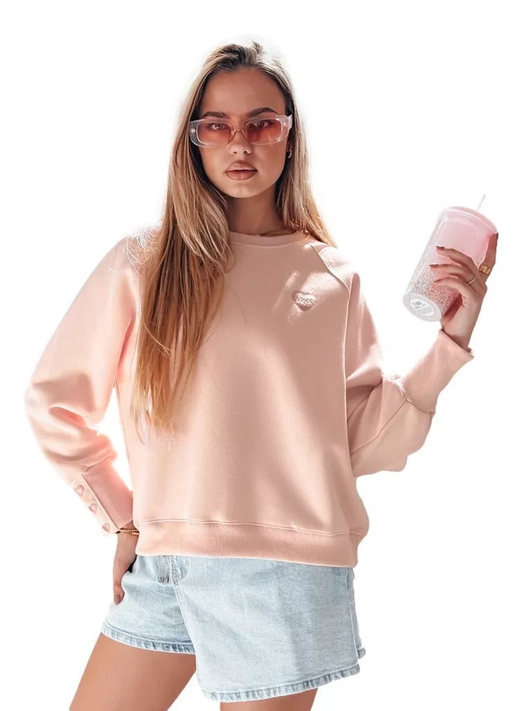 Moteriškas džemperis su dekoratyviniu širdelių siuvinėjimu ir užrašu "LOVE" ant krūtinės bei mielomis širdelėmis ant rankovių. Džemperio modelis, be gobtuvo, su apvalia apykakle ir elastingais rankogaliais. Universalus dydis tinka nuo XS iki L. Minkšta medžiaga užtikrina patogumą dėvėti. Tobulas pavasario stiliaus pasiūlymas.