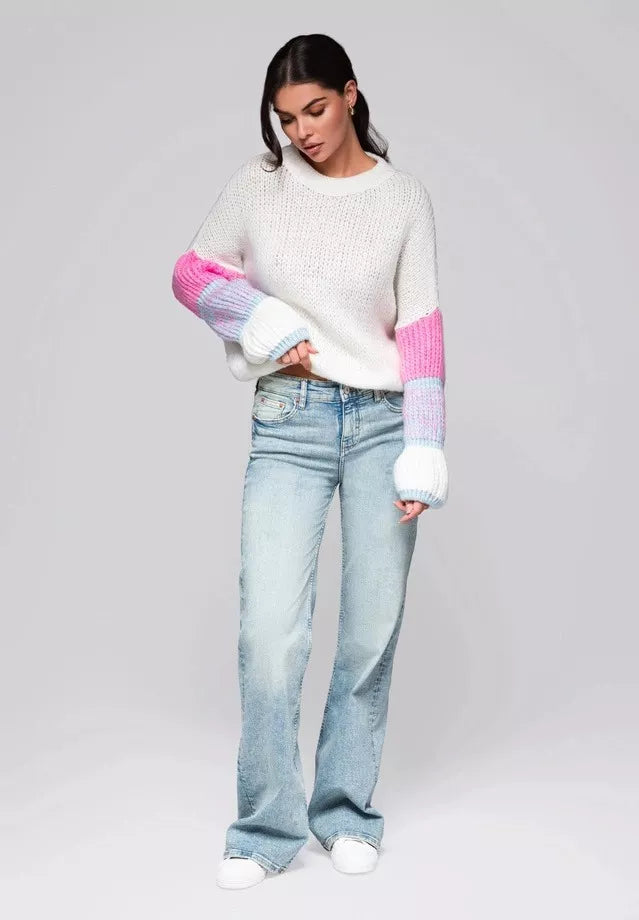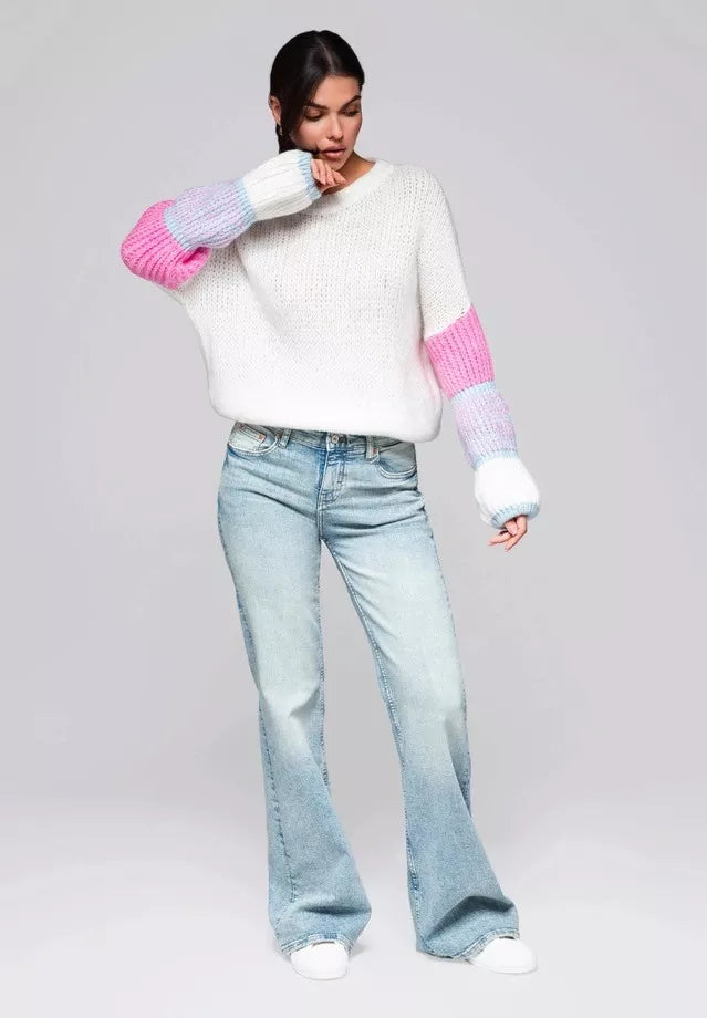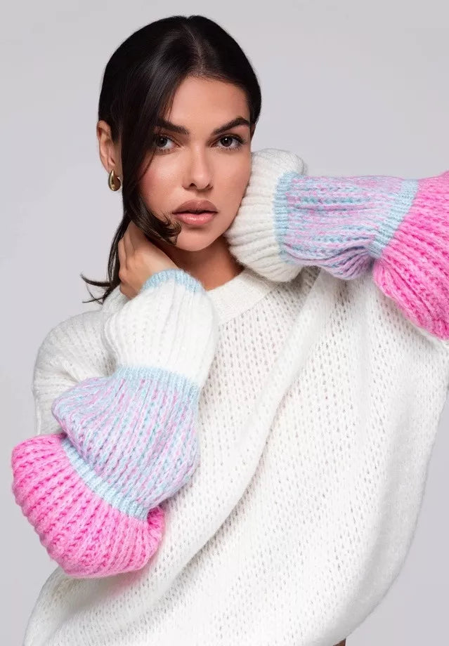 Ryškus, stilingas moteriškas megztinis, puikiai tinkantis tiek kasdienai, tiek išskirtiniam įvaizdžiui. Rankovės dekoruotos plačiomis spalvotomis juostomis: mėtų žalia, šviesiai violetine, geltona ir oranžine. Modelis: laisvo silueto, su apvalia iškirpte, patogus ir nevaržantis judesių. Rankovės: ilgos, platesnės, su ryškiomis spalvinėmis blokų kombinacijomis, kurios kuria jaunatvišką stilių. Medžiaga: minkšta, šilta ir maloni dėvėti – puikus pasirinkimas rudens ar žiemos sezonui. Derinimas: puikiai atrodo prie džinsų ar sijonų, lengvai pritaikomas tiek kasdieniam, tiek laisvalaikio įvaizdžiui. Šis megztinis suteiks jūsų garderobui spalvingumo ir išskirtinumo.