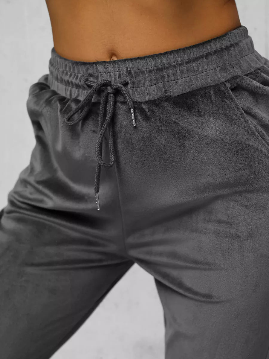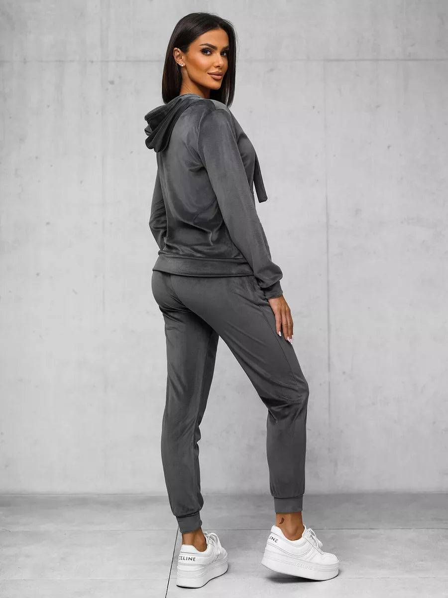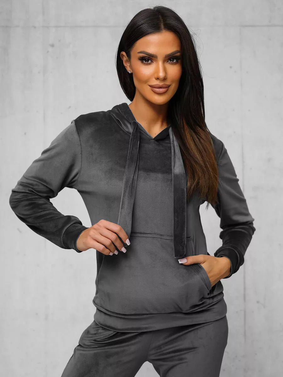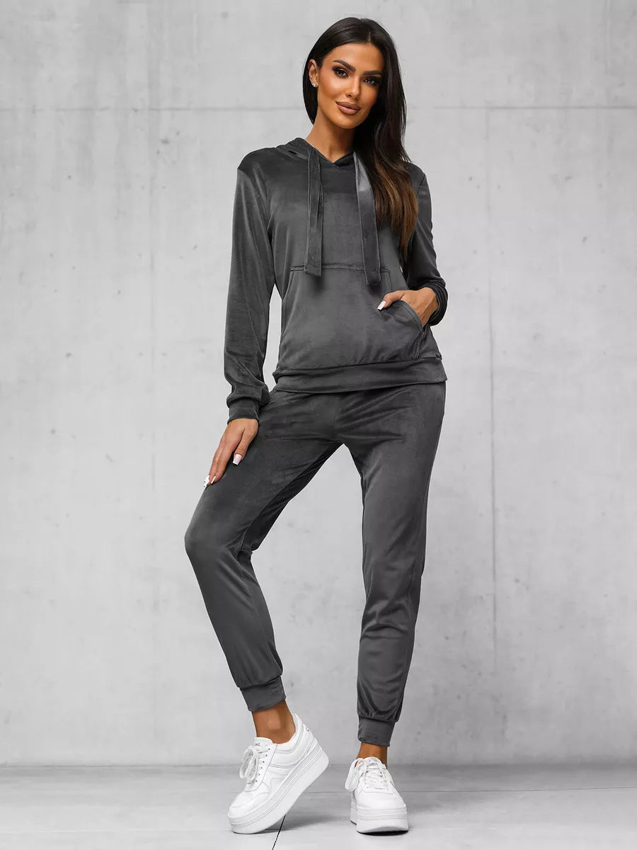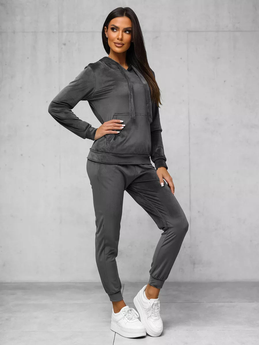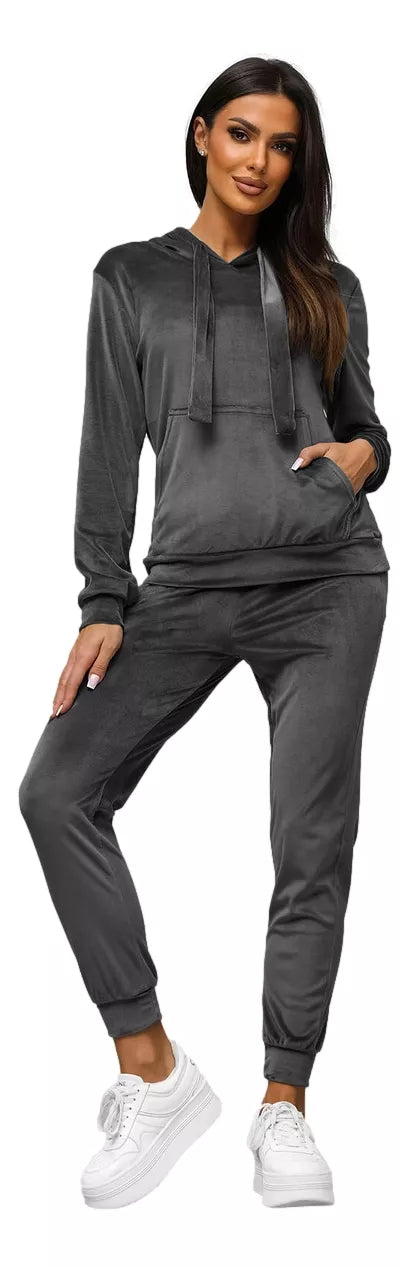 Moteriškas veliūrinis komplektas puikus pasirinkimas kasdieniam dėvėjimui. Komplektą sudaro patogus džemperis su gobtuvu reguloiuojamas dekoratyviniais raišteliais. Sukurtas iš aukštos kokybės medžiagos: 92% poliesterio ir 8% elastano. Šis komplektas ne tik suteikia komfortą, bet ir atrodo stilingai. Modelis (174 cm) dėvi M dydžio drabužį, todėl puikiai tinka įvairioms figūros tipams.