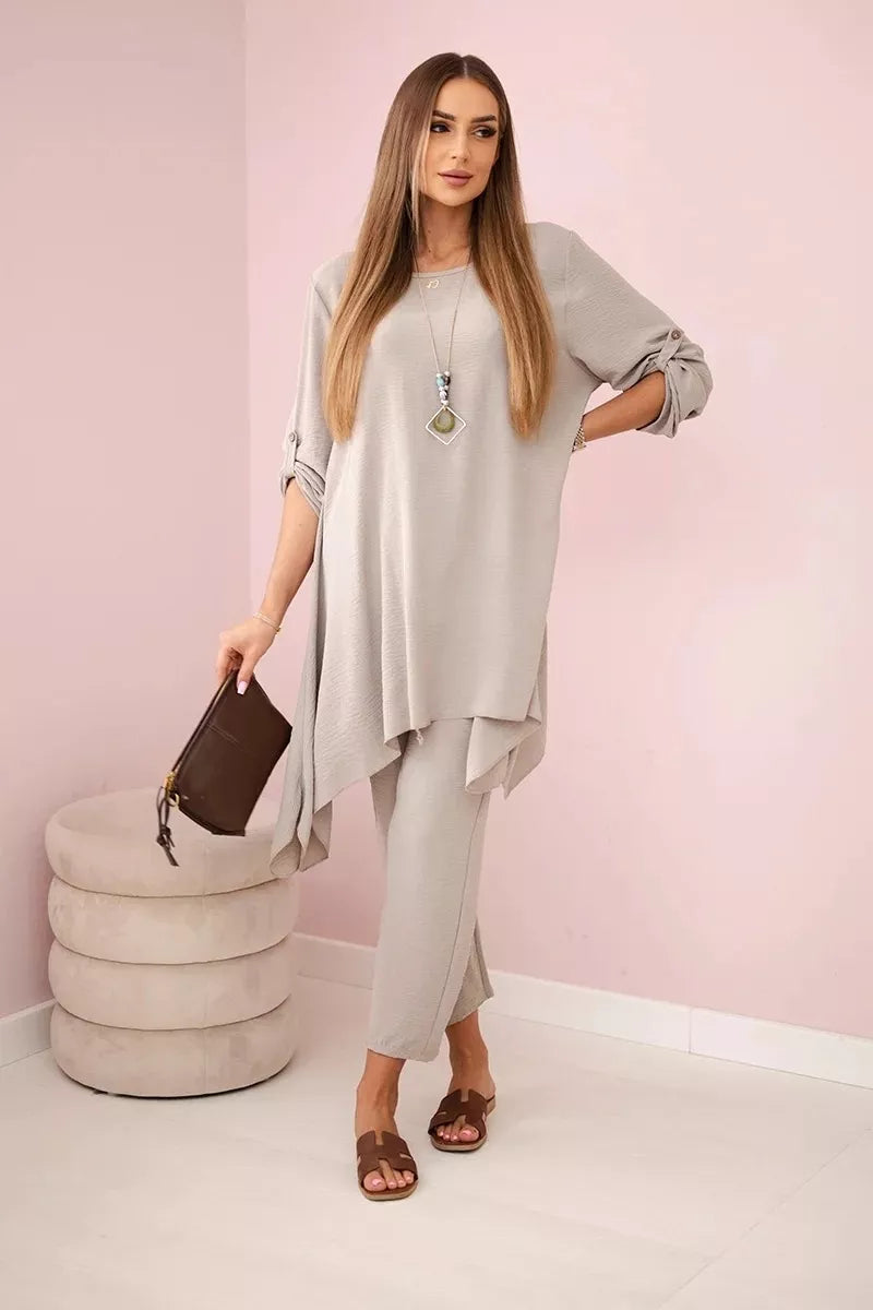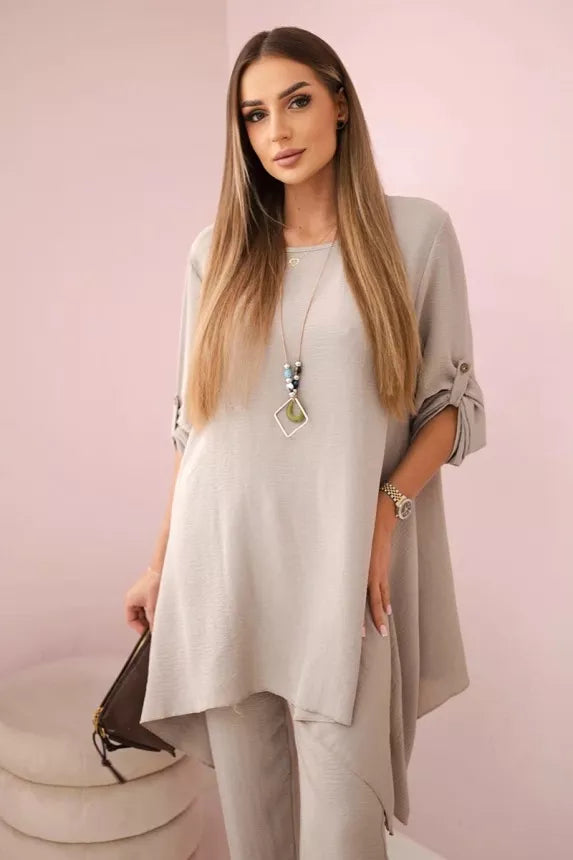 Itališkas dviejų dalių komplektas, kurį sudaro platėjanti palaidinė ir kelnės, yra elegantiškas komplektas, suteikiantis žavesio ir stiliaus bet kokiam stiliui. Platėjančios formos palaidinė suteikia subtilaus moteriškumo, pabrėžia figūrą ir užtikrina judėjimo laisvę. Klasikinis kelnių kirpimas puikiai dera su elegantiška palaidine, sukuriant darnią ir stilingą visumą. Be to, rakto formos pakabukas yra žavinga detalė, suteikianti šiam rinkiniui originalumo ir charakterio, sukurianti harmoningą kompoziciją. Tai elegantiškas aksesuaras, pabrėžiantis unikalumą ir dėmesį detalėms visame stiliuje. Šis itališkas rinkinys puikiai tinka įvairioms progoms – nuo verslo susitikimų iki romantiškų pasimatymų. Tai rafinuotas pasirinkimas žmonėms, vertinantiems eleganciją ir patogumą viename. Dydis universalus ir tinka moterims, dėvinčioms S, M arba L dydžius.