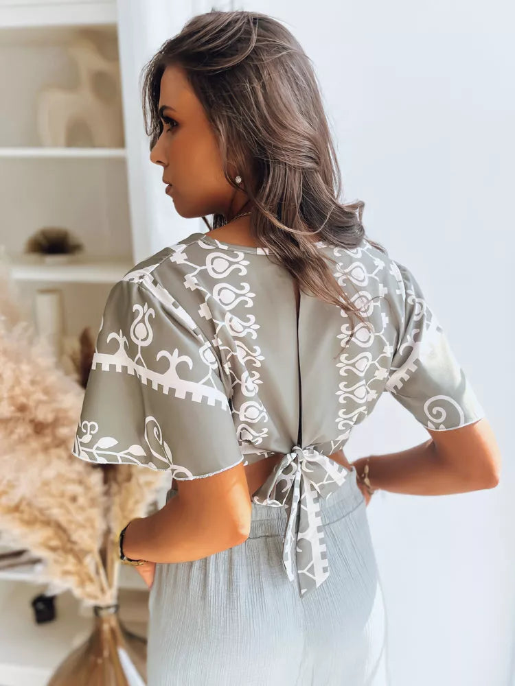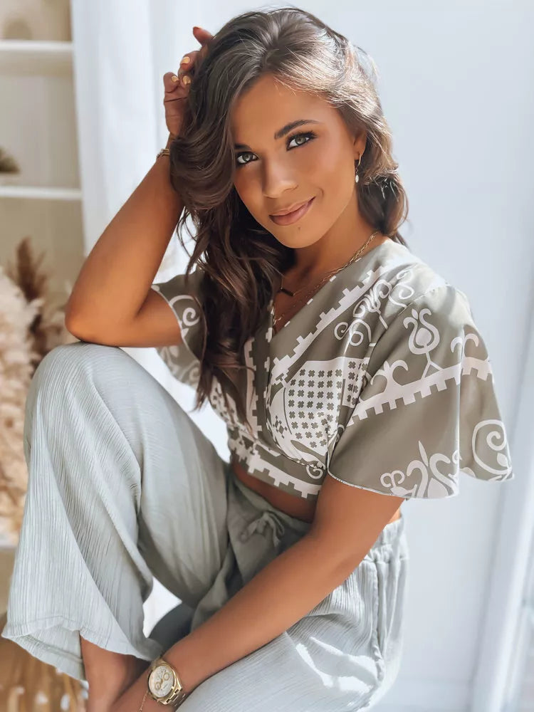 Trumpo kirpimo viršutinė dalis - topas, pagaminta iš švelnios medžiagos. Turi klostuotą V formos iškirptę bei laisvas rankoves.