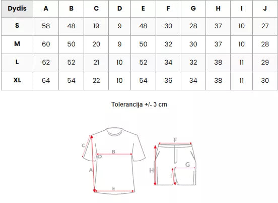 Stilingas ir patogus komplektas, pagamintas iš aukštos kokybės medžiagos (92% poliesteris, 8% elastanas), užtikrinančios lankstumą ir komfortą. Komplektą sudaro juodos spalvos trumpomis rankovėmis marškinėliai ir šortai su raišteliais, kurie suteikia papildomo patogumo. Marškinėliai yra laisvo kirpimo, leidžiantys jaustis laisvai bet kokioje situacijoje, o šortai turi elastinę juosmens juostą, puikiai priglundančią prie kūno. Modelis (168 cm ūgio) dėvi S dydį. Puikus pasirinkimas tiek aktyviam laisvalaikiui, tiek kasdieniam dėvėjimui!