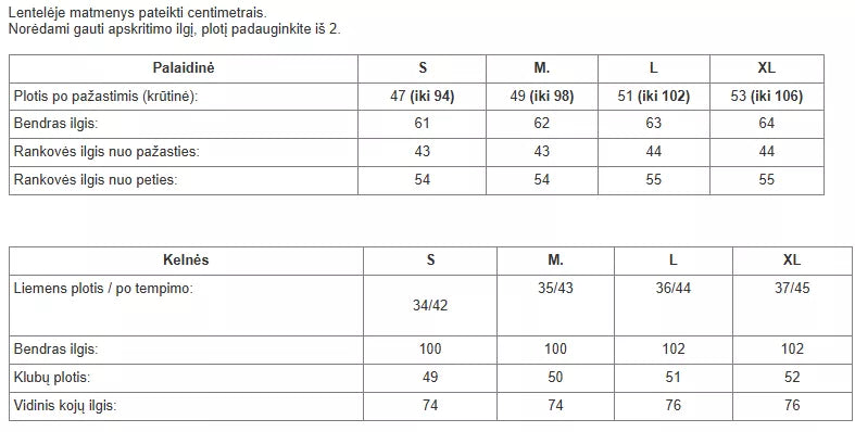 Dydžių lentelė nuotraukų galerijoje, lentelėje matmenys pateikti centimetrais.