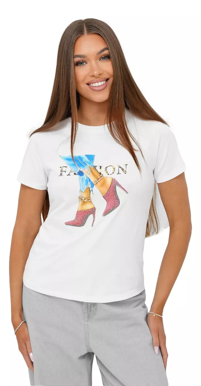 Išskirtinio dizaino marškinėliai moterims su spalvinga iliustracija ir spindinčiu užrašu „FASHION“. Paveikslėlis su aukštakulniais bateliais ir džinsais suteikia šiam modeliui madingą ir drąsų akcentą. Puikus pasirinkimas ieškančioms stiliaus bei patogumo derinio!