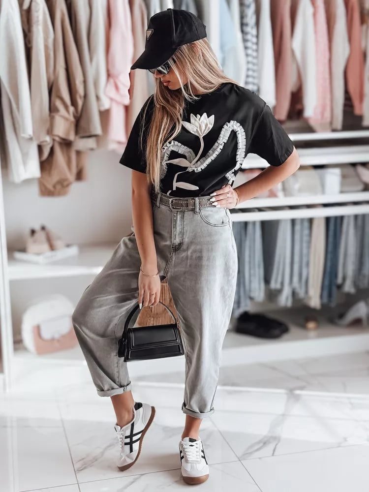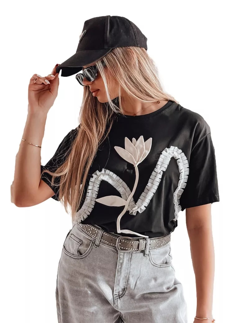 Priekį puošia unikali 3D juodos gėlės aplikacija, kuri suteikia aprangai stilingą ir modernų charakterį. Laisvas kirpimas užtikrina maksimalų komfortą ir leidžia nevaržomai judėti.