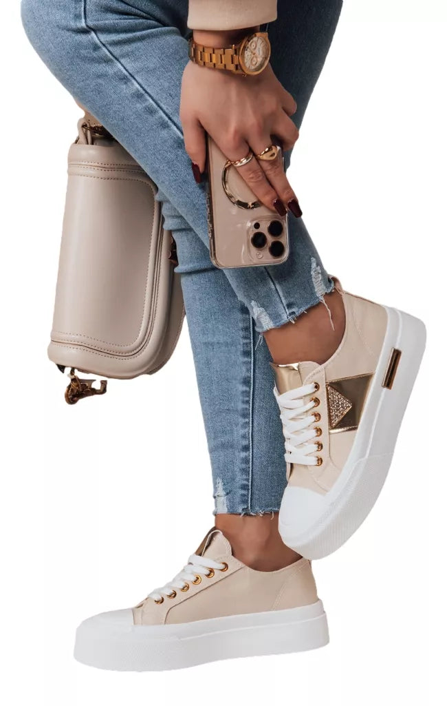 Moteriški sportbačiai ant aukštos platformos, pagaminti iš audinio. Viršutinė dalis su raišteliais. Bateliai turi deimanto formos dekoraciją, kuri suteikia žavesio ir elegancijos. Jie dera tiek prie kelnių, tiek prie suknelių, todėl yra universalus pasirinkimas bet kokiai progai.