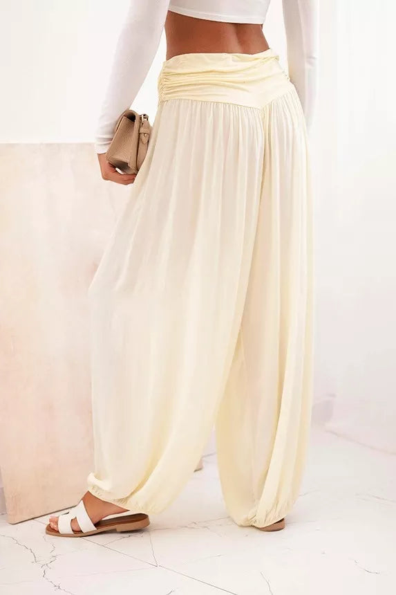 Šios unikalios moteriškos plačios kelnės su subtiliais raukiniais puikiai tinka kasdieniam dėvėjimui ir ne tik. Pagamintos iš 100 % minkštos viskozės, jos yra lengvos ir patogios dėvėti net šiltesnėmis dienomis. Elastinis juosmuo užtikrina komfortą ir puikų prigludimą, o laisvas kirpimas leidžia laisvai judėti ir atrodo madingai. Elastiniai rankogaliai kelnių apačioje suteikia kelnėms unikalų charakterį ir subtiliai paryškina figūrą. Jos puikus pasirinkimas pasivaikščiojimui, apsipirkimui, kelionei ar poilsiui namuose. Paprastas dizainas ir neutralios spalvos leidžia jas lengvai derinti prie įvairių aprangos variantų – nuo sportinio iki laisvalaikio. Vienas dydis tinka visiems, tinka S, M arba L dydžio moterims.