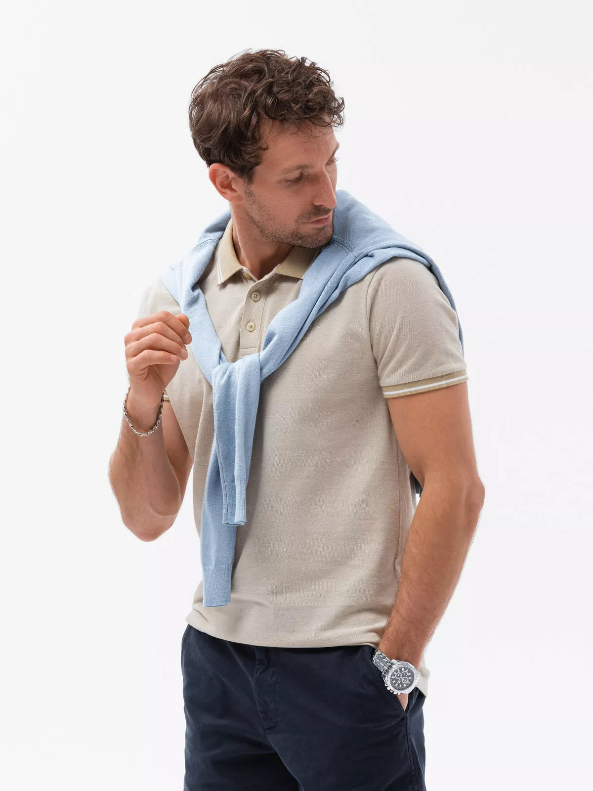 Vyriški polo marškinėliai su apykakle užsegama sagutėmis. Juostelėmis dekoruotos rankovės bei apykaklė. Prekinio ženklo siuvinėjimas ant krūtinės.
