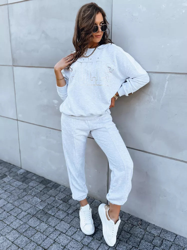 Sportinio kostiumo komplektas yra puikus pasirinkimas kiekvienai moteriai, kuri vertina komfortą. Modelis turi lengvą, oversize džemperį su aukso spalvos užrašu ir sportines kelnes.