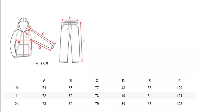Vyriškas komplektas sudarytas iš džemperio ir laisvalaikio kelnių. Džemperis su gobtuvu ir spauda priekyje. Laisvalaikio kelnių liemuo reguliuojasi raišteliu ir turi dvi kišenes. Komplektą galima dėvėti ir atskirai.