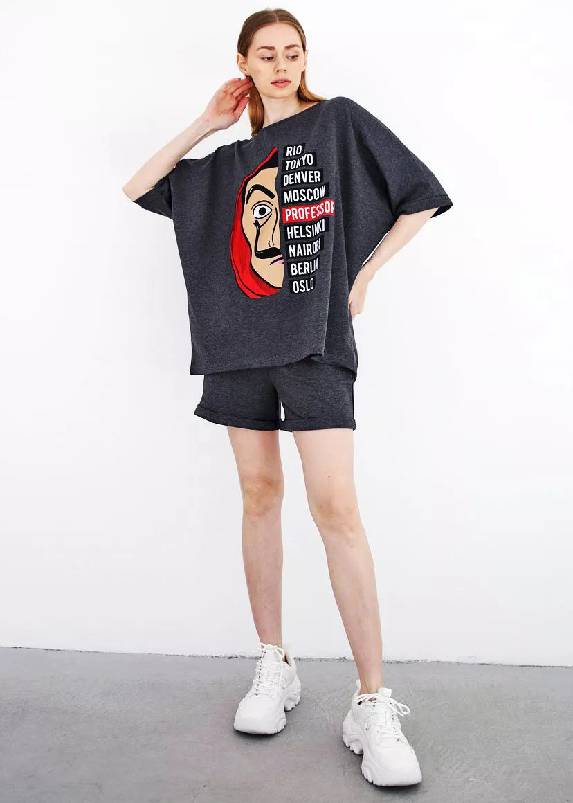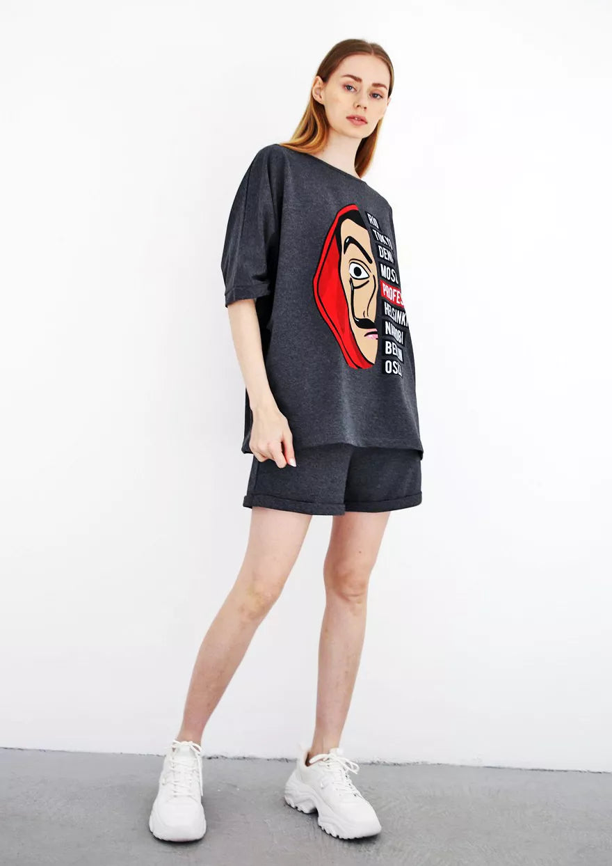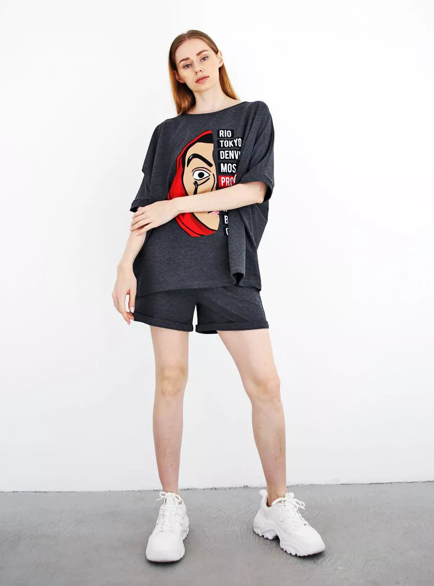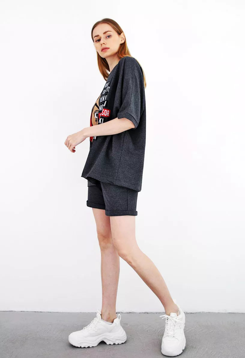 Moteriškas dviejų dalių komplektas patiks kiekvienai mylinčiai patogumą. Marškinėliai ir šortai be pūkelio.