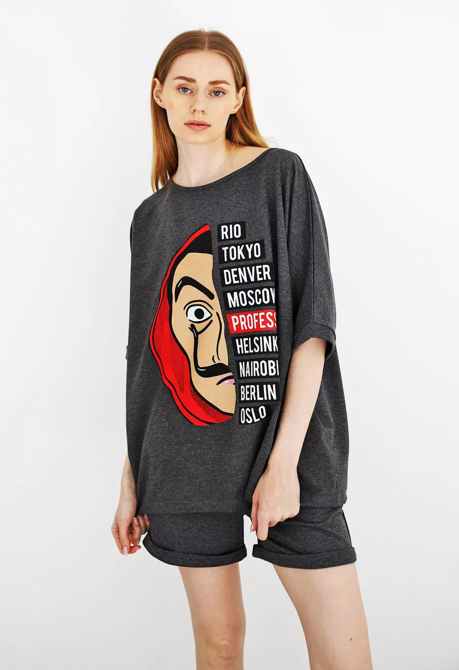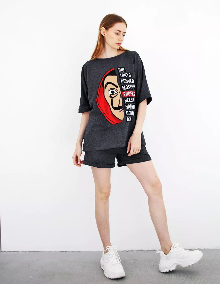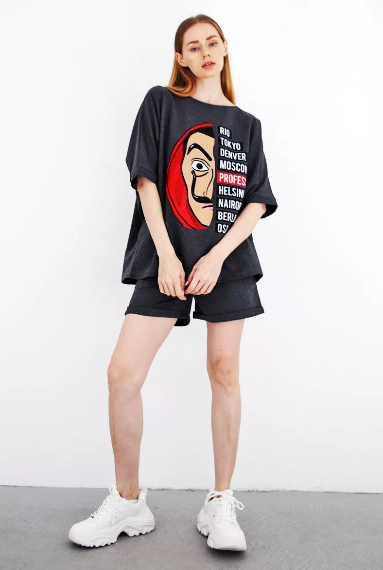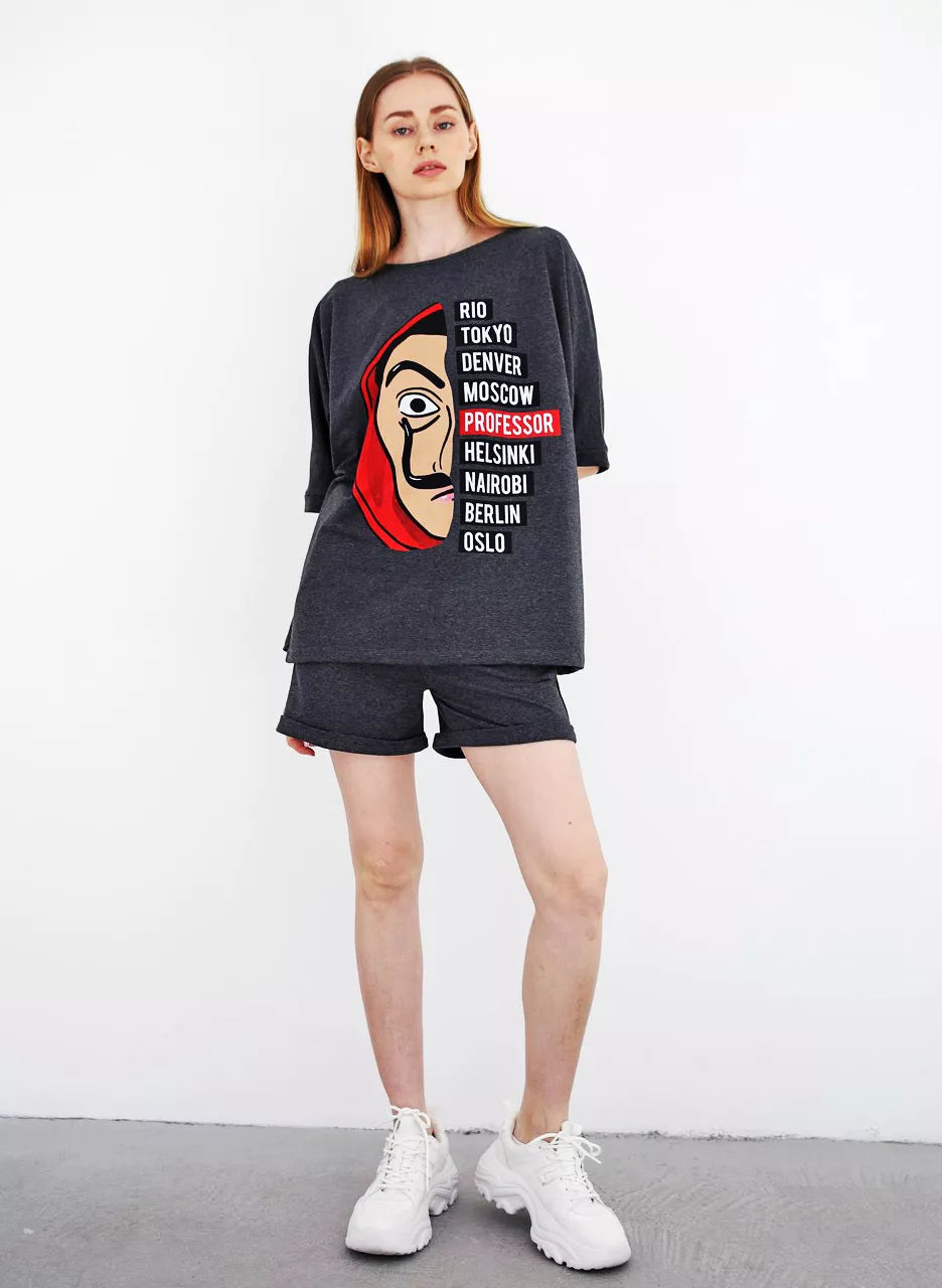 Moteriškas dviejų dalių komplektas patiks kiekvienai mylinčiai patogumą. Marškinėliai ir šortai be pūkelio.