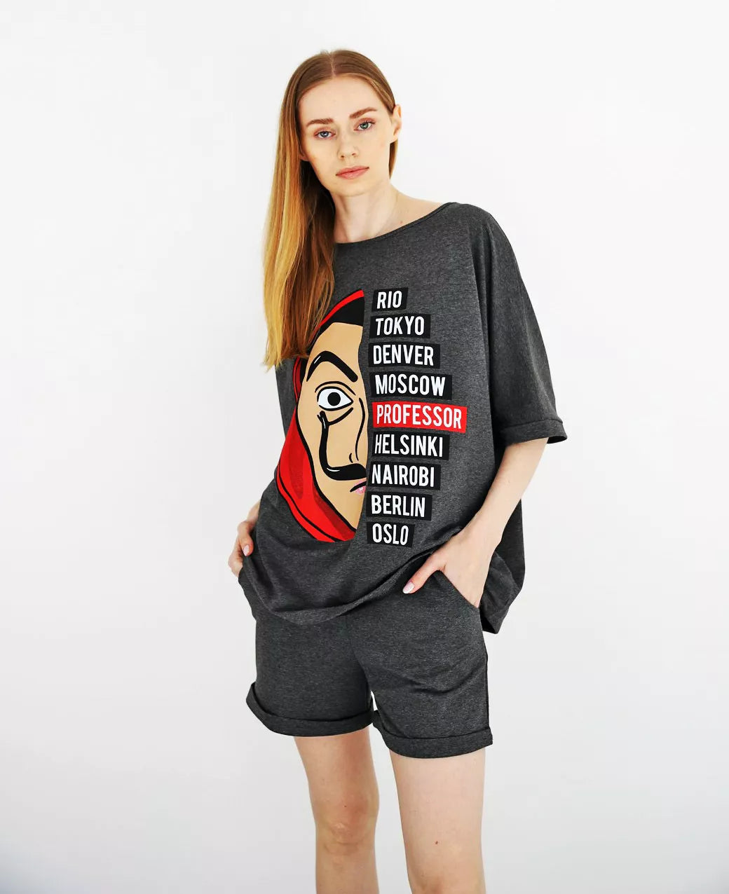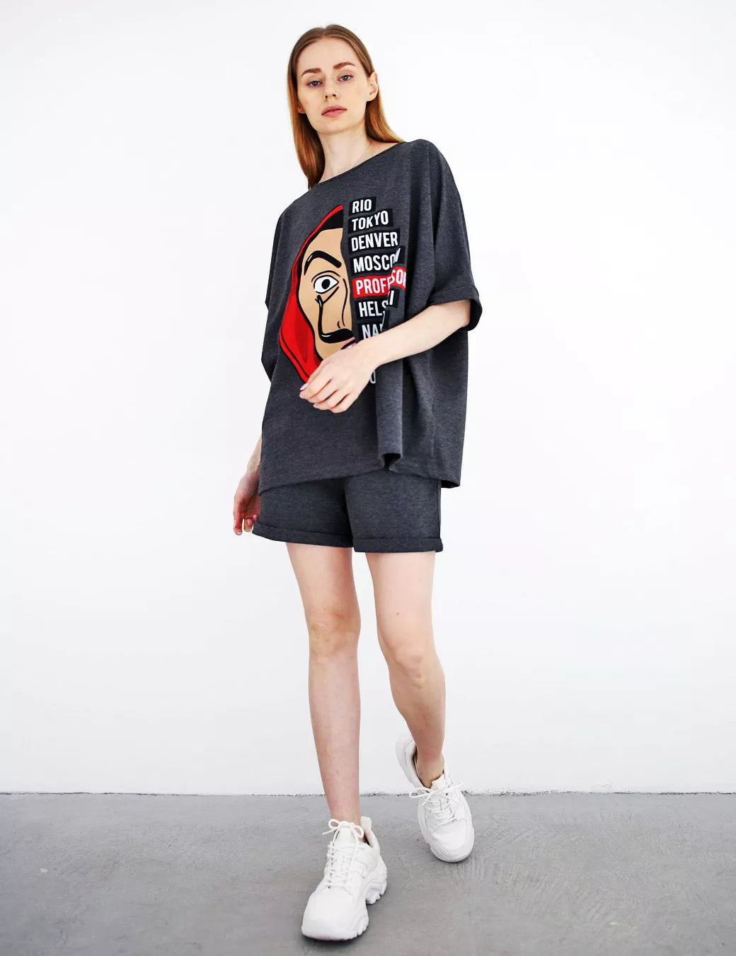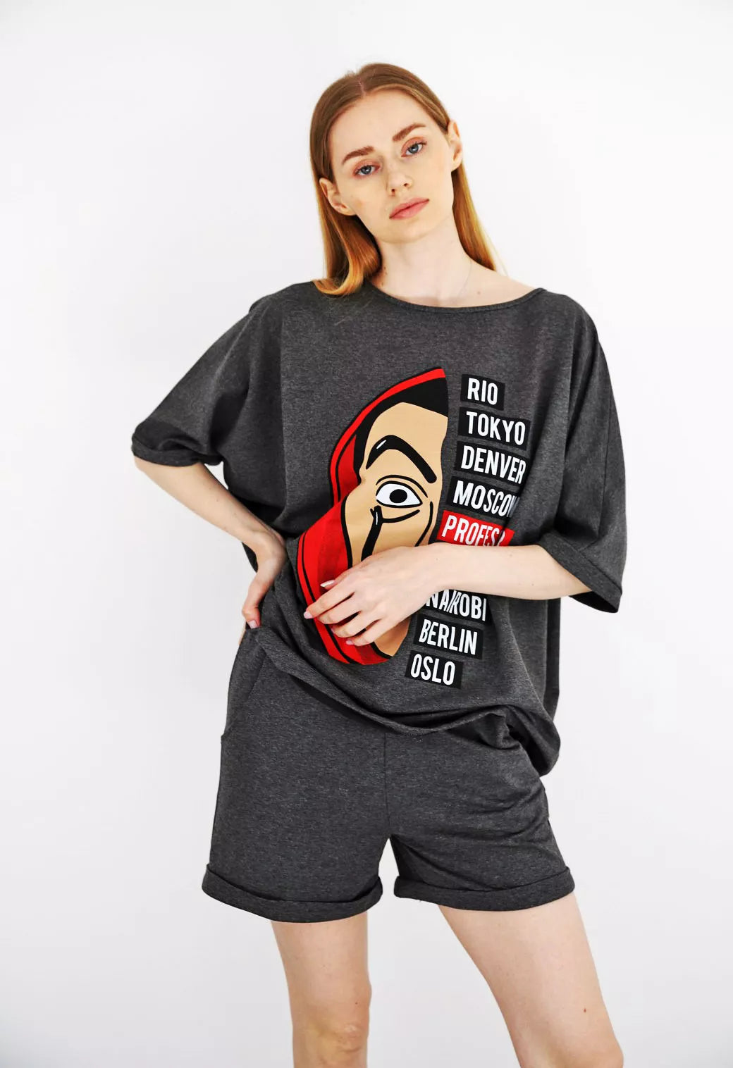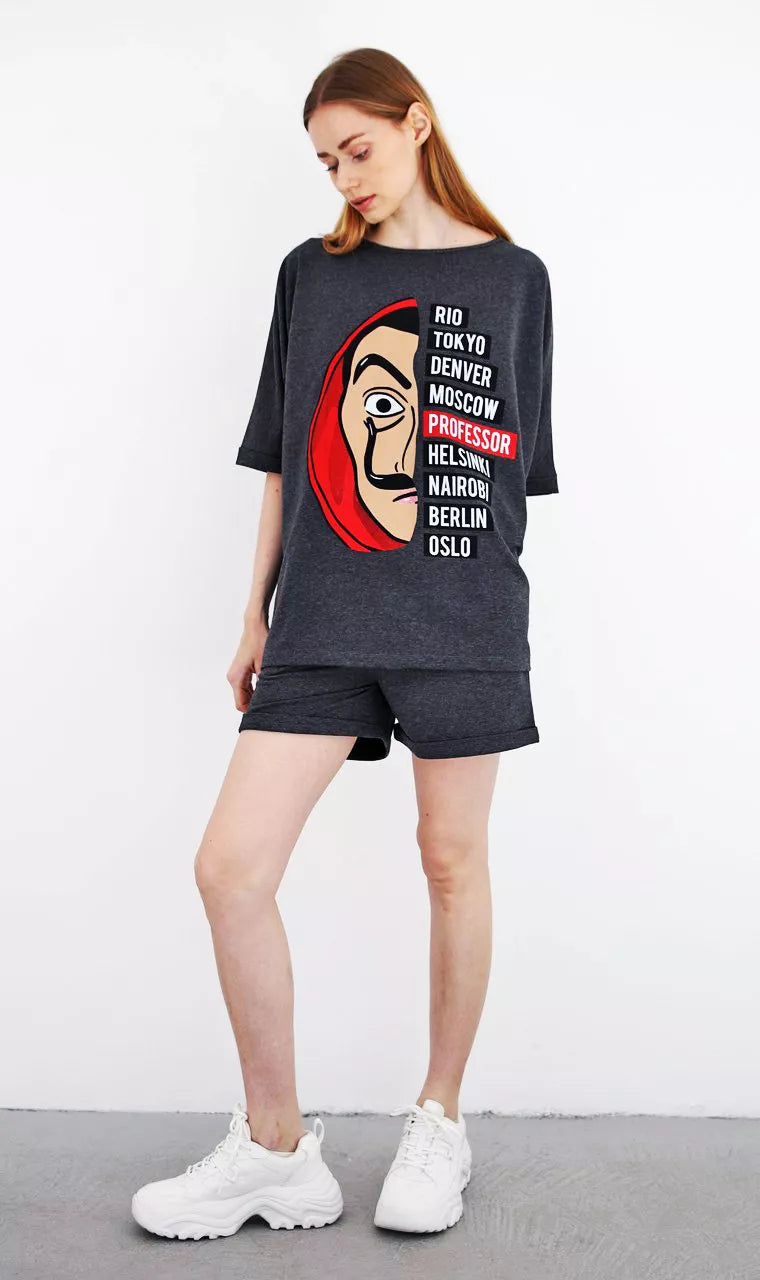 Moteriškas dviejų dalių komplektas patiks kiekvienai mylinčiai patogumą. Marškinėliai ir šortai be pūkelio.