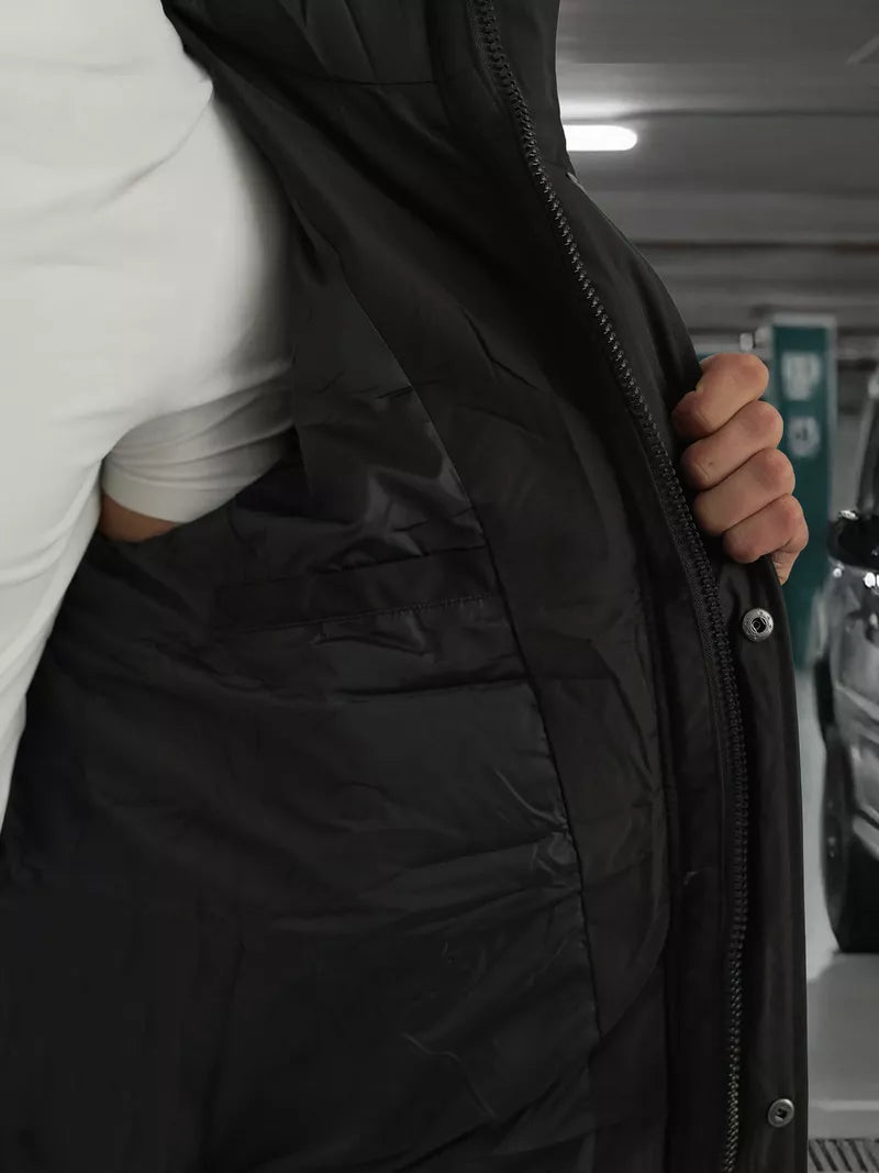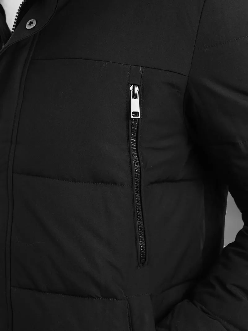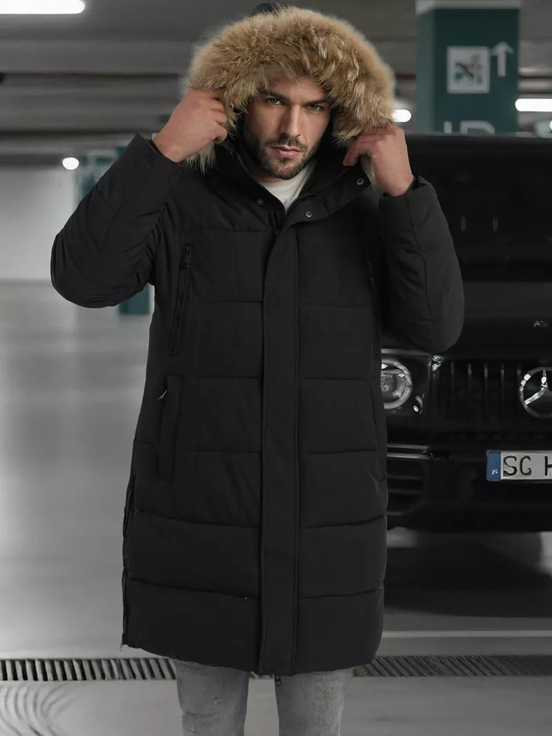 Vyriška žieminė striukė su nuimamu gobtuvu taip pat nusiima kailiukas. Aukšta apykaklė. Yra užsegamos kišėnės.