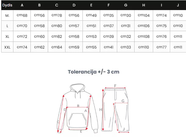 Vyriškas sportinis kostiumas – stilingas ir patogus pasirinkimas aktyviam laisvalaikiui ar kasdieniam dėvėjimui. Komplektą sudaro džemperis su gobtuvu ir užtrauktuku bei sportinės kelnės. Džemperis turi reguliuojamus raištelius gobtuvui, dvi šonines kišenes ir tamprius rankogalius, užtikrinančius komfortą bei gerą prigludimą. Kelnės siaurėjančio modelio, su tampria juosmens juosta ir sutvirtintais galais ties kulkšnimis, todėl patogiai priglunda ir nevaržo judesių.