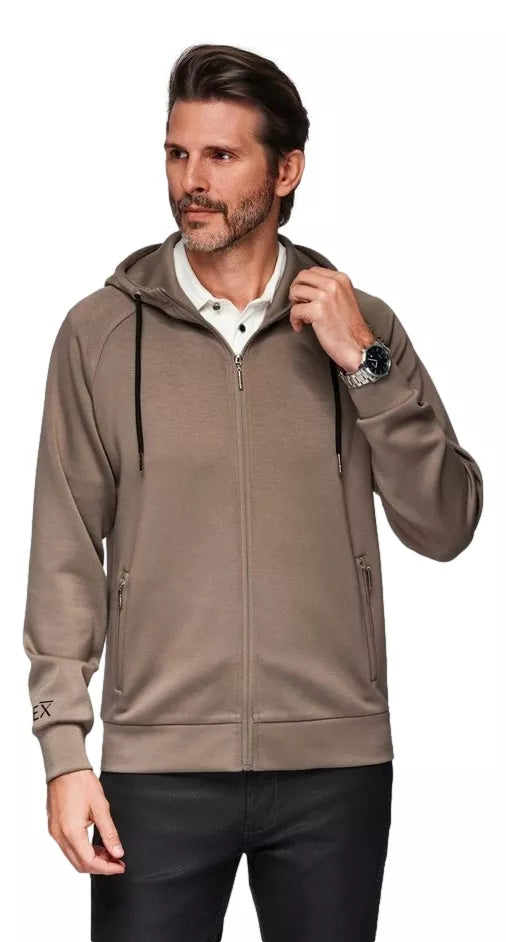 Modernus vyriškas džemperis laisvalaikio stiliumi, kuriame dera sportiškas kasdieniškumas ir kasdienio komforto elegancija. Sukurtas vyrams, vertinantiems funkcionalumą ir madingą išvaizdą, puikiai tiks tiek miesto stiliui, tiek savaitgalio poilsiui. Subtilūs rafinuotos detalės suteikia jam charakterio ir modernumo. Gobtuvas reguliuojamas raišteliu, yra dvipusis užtrauktuka, šoninės kišenės su užtrauktuku. Dekoratyvinis blizgus silikoninis spaudinys ant peties ir rankovėsMedžiaga: išorinė medžiaga: 48% viskozė, 46% poliesteris, 6% elastanasModelio ūgis 185 cm. Modelis rodo produktą M dydžio.