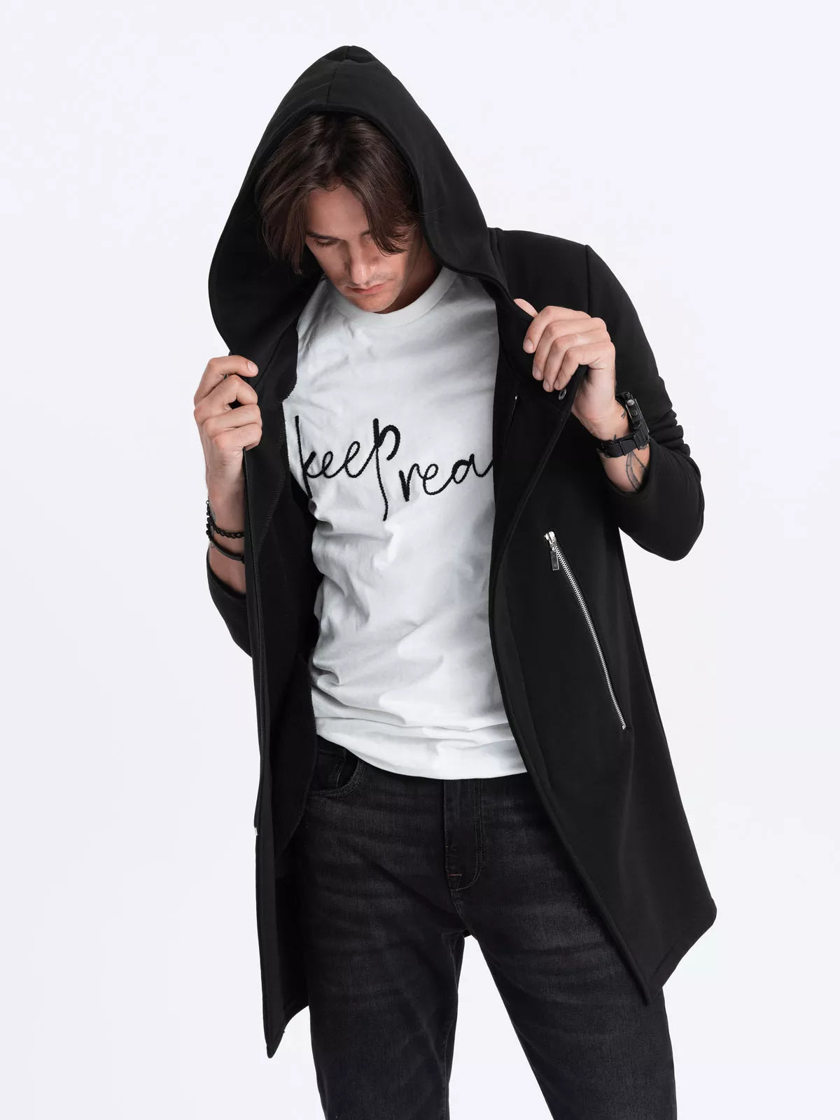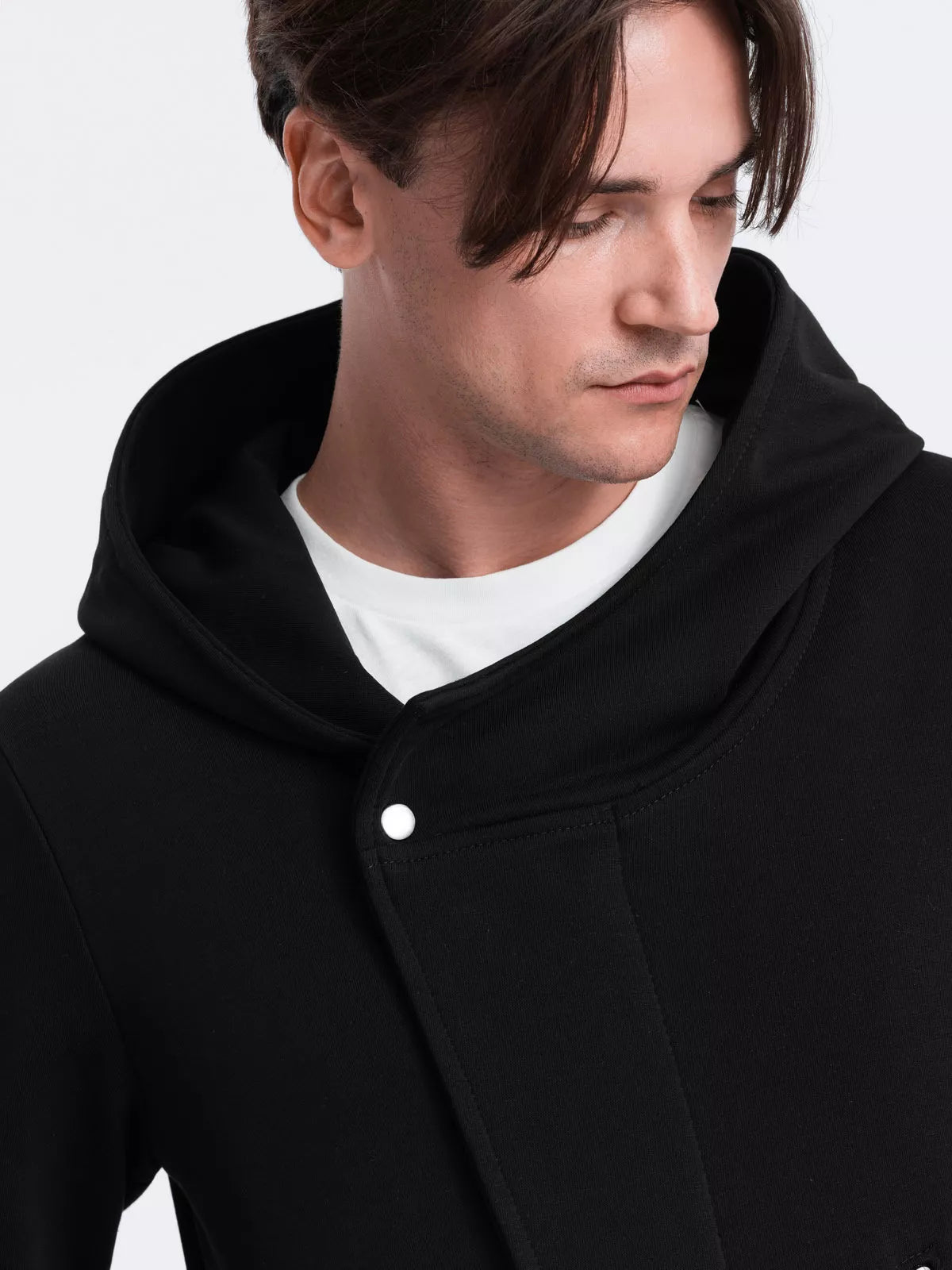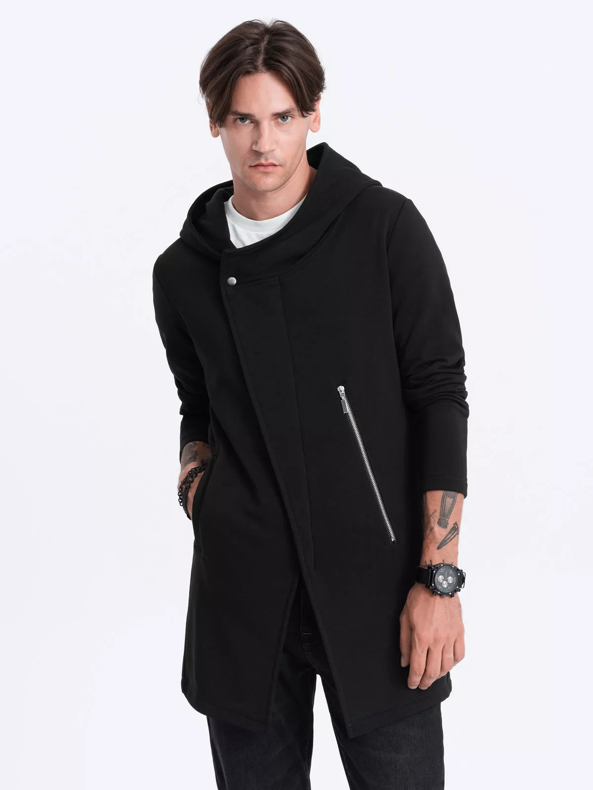 Modernaus dizainerio kirpimo megztinis. Erdvus gaubtas. Užsiūtas metalinis užtrauktukas imituojantis kišenę. Klasikinė kišenė dešinėje.