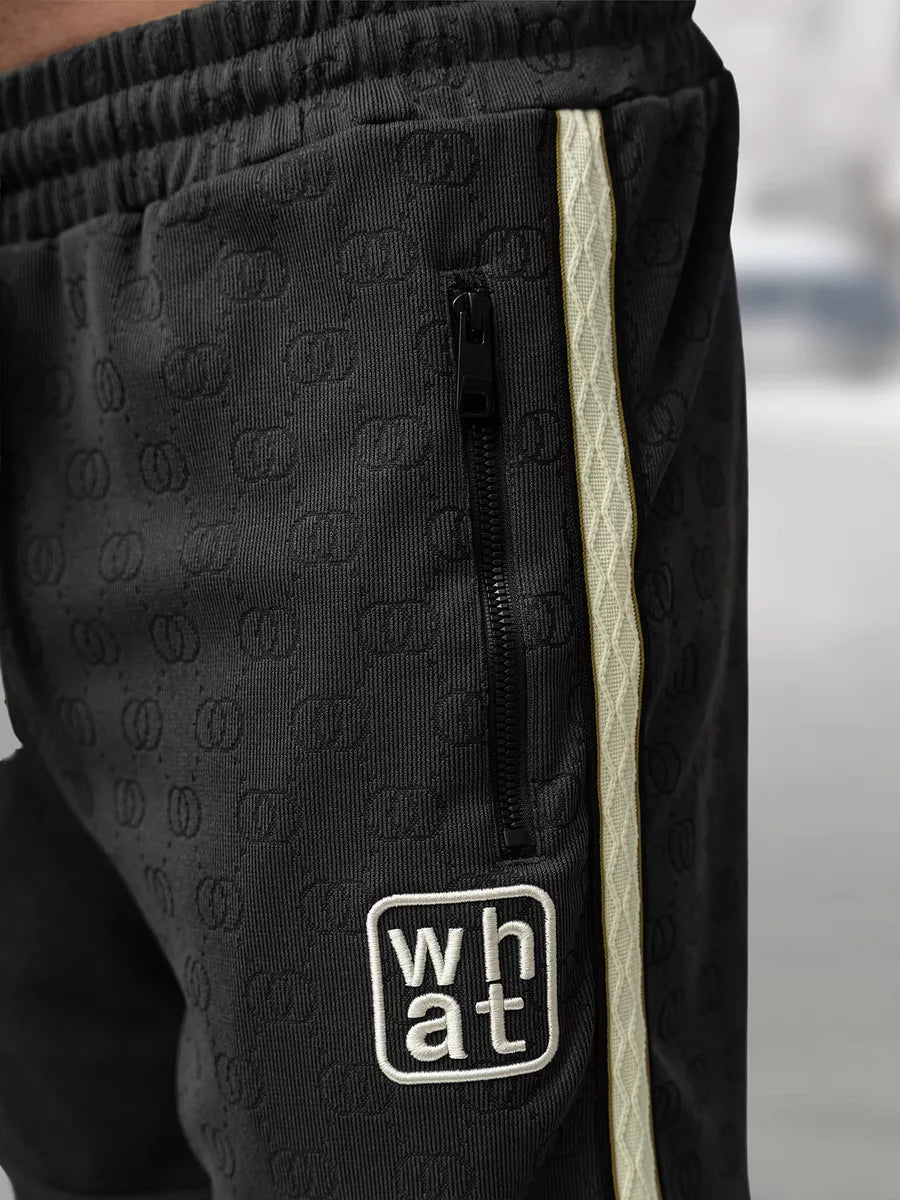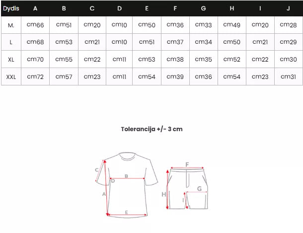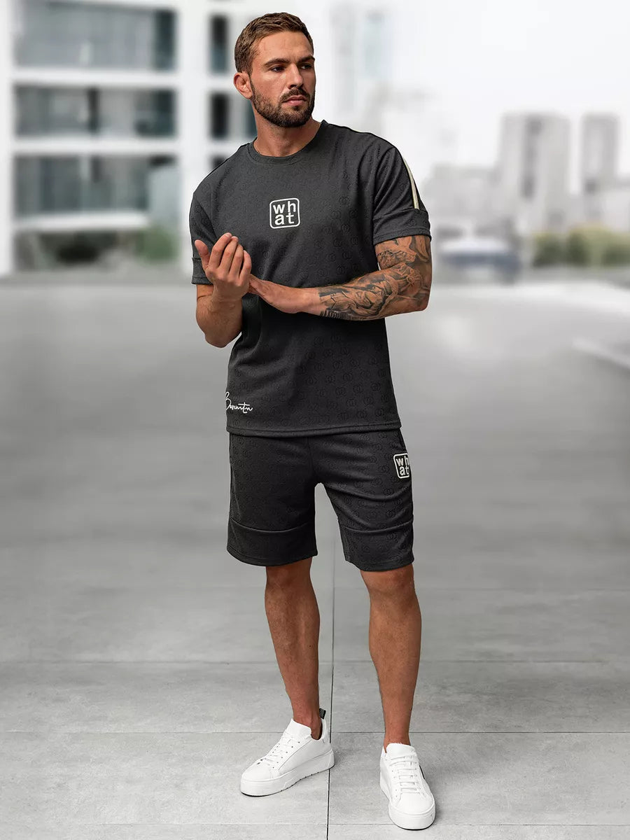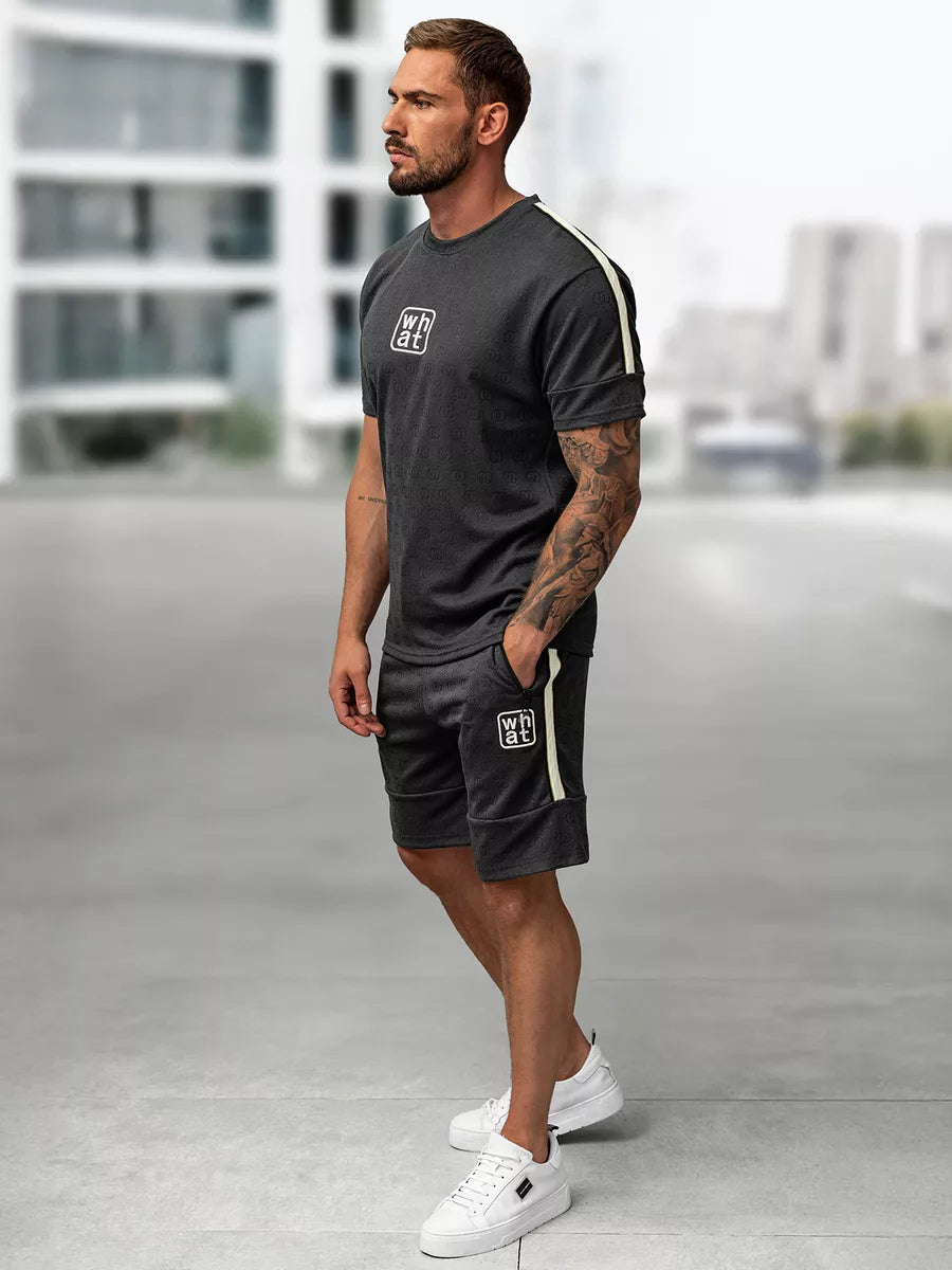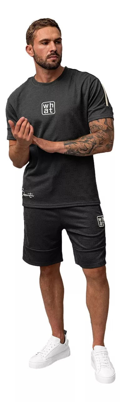Marškinėliai turi minimalistinį užrašą „what“ ant krūtinės ir baltą juostelę palei petį. Šortai – su kišenėmis ir šonine dekoro juostele, puikiai dera su marškinėliais. Komplektas idealiai tinka tiek aktyviam laisvalaikiui, tiek kasdieniam stiliui.