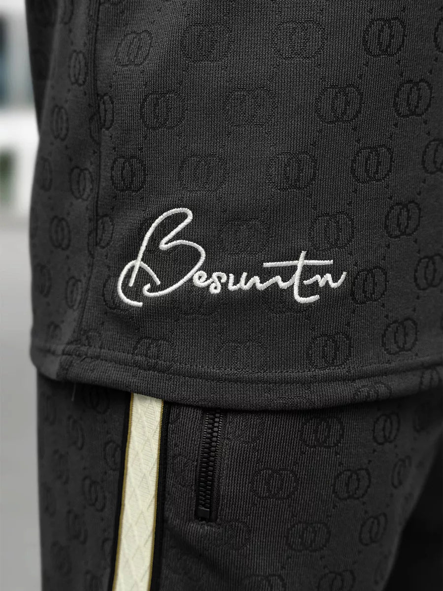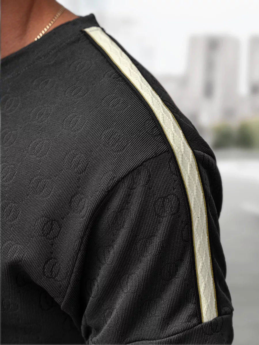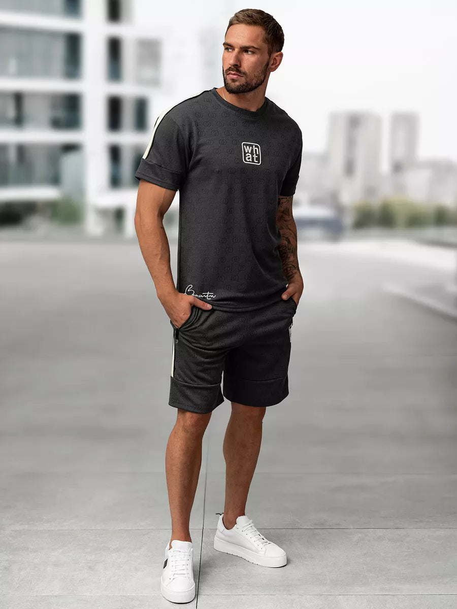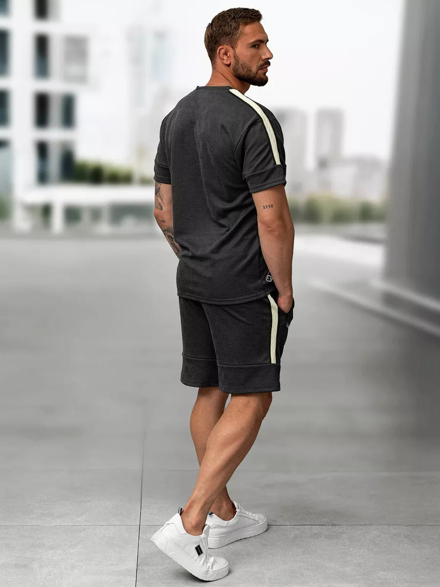 Stilingas ir patogus dviejų dalių komplektas vyrams – puikus pasirinkimas šiltajam sezonui. Komplektą sudaro trumpomis rankovėmis marškinėliai ir šortai, pasiūti iš lengvo, kvėpuojančio audinio. Audinys subtiliai dekoruotas įspaustu raštu, suteikiančiu išskirtinumo.