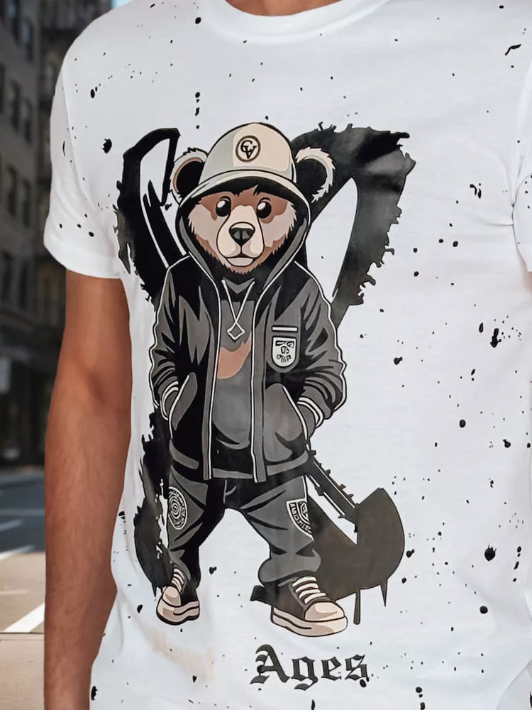 Vyriški marškinėliai su meškiuko raštu ir dažų taškeliais – tai gatvės stiliaus energijos ir madingo charakterio derinys. Patogus kirpimas su apvalia iškirpte užtikrina komfortą visą dieną, o unikalus raštas suteikia stiliui išraiškingumo. Puikiai tinka su džinsais ar šortais prie kasdienės, miesto aprangos.