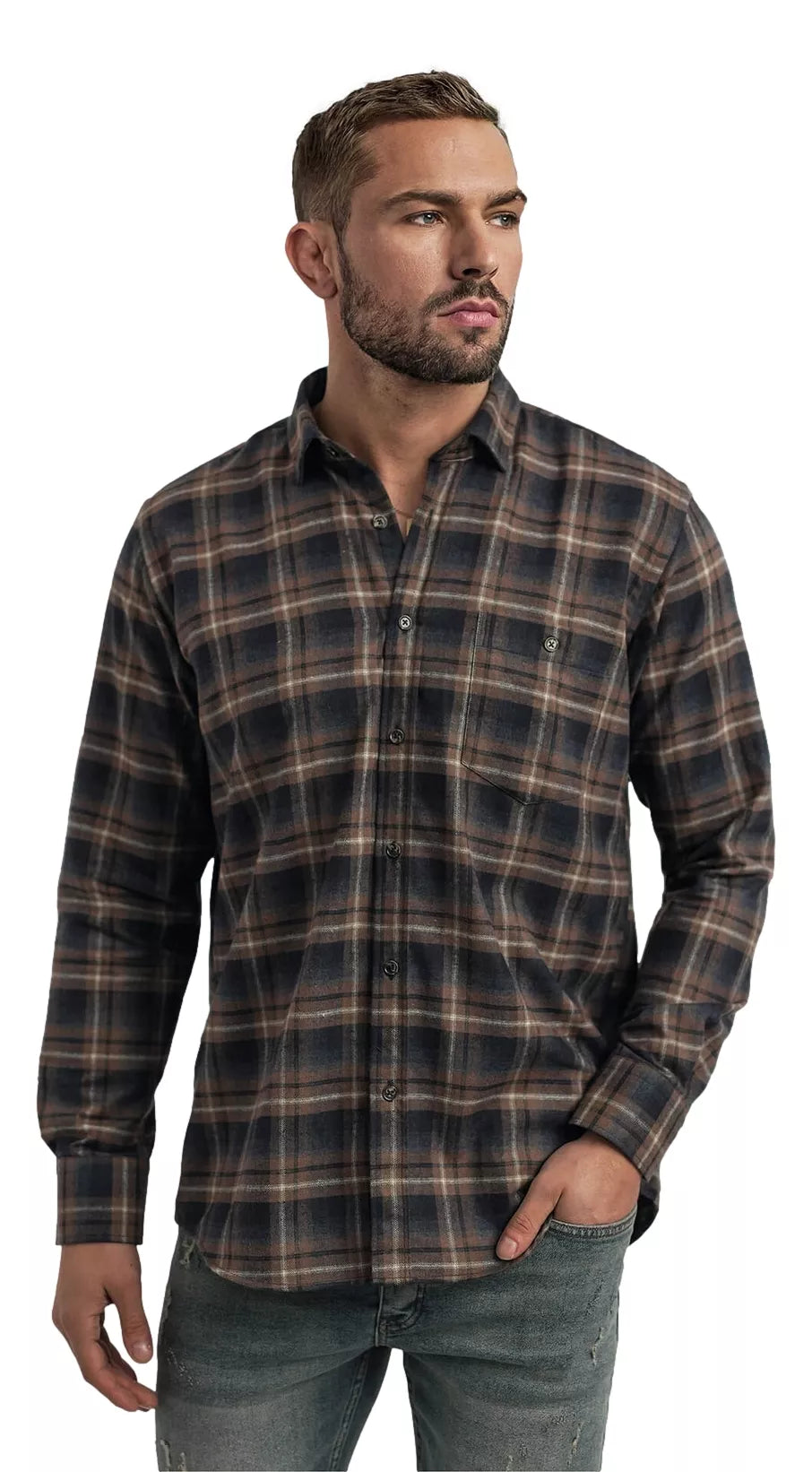 Pagaminti iš minkšto, kvėpuojančio audinio, užtikrinančio komfortą visos dienos metu. Klasikinis kirpimas nevaržo judesių, o sagomis užsegama priekinė dalis ir rankogaliai leidžia reguliuoti dėvėjimo patogumą. Subtilus languotas raštas suteikia išskirtinumo, tačiau išlaiko vyrišką solidumą.