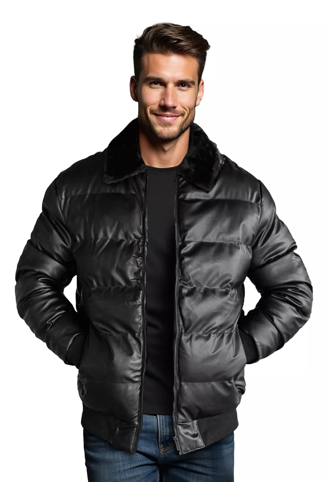 Naujausios kolekcijos juoda vyriška striukė Dorian. Pagaminta iš eko odos su kailio imitacijos apykakle.